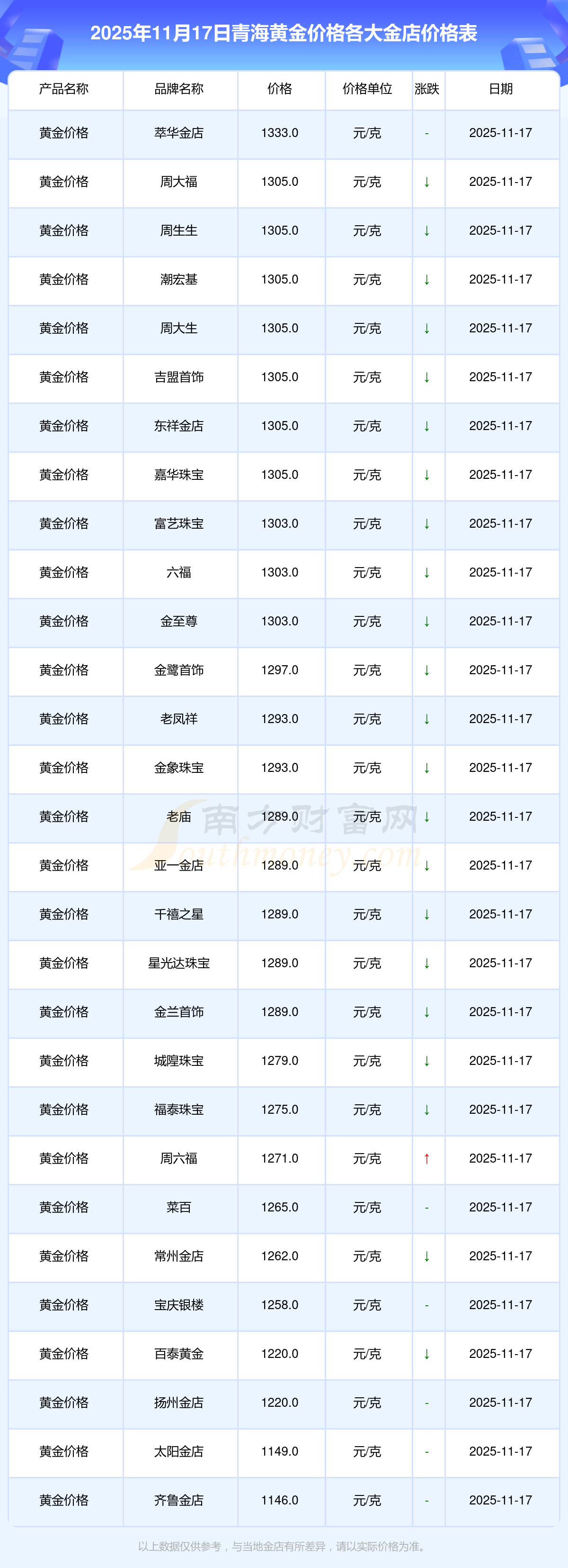 2025年11月17日青海各大金店黄金价格最新价格查询来了:谢瑞麟1305.0元/克,谢瑞麟46270.0,谢瑞麟13490.0,谢瑞麟41990.0,金银街1280.0元/克,金银街1295.0元/克,金银街1285.0元/克,金银街11.5元/克,金银街921.0元/克,金银街10.7元/克,多边金都珠宝1256.0元/克。
