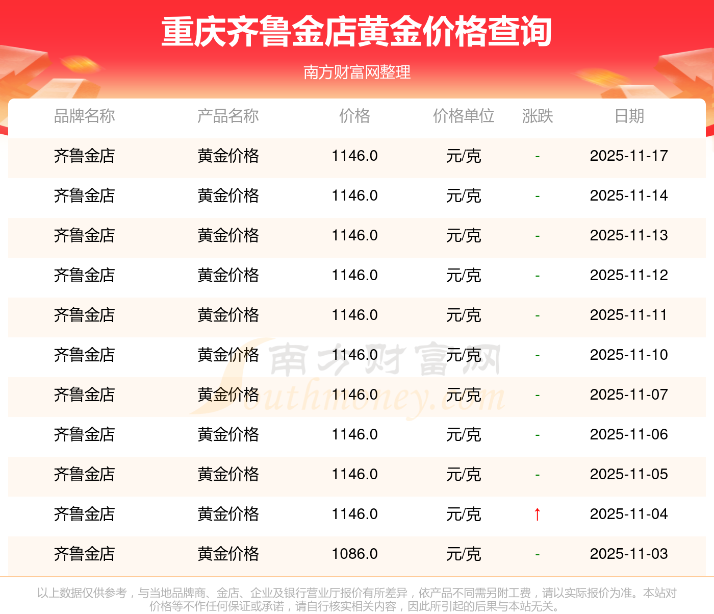 今日重庆齐鲁金店黄金价格公布黄金价格今天多少一克2025年11月17日重庆齐鲁金店黄金价格是1146.0元/克。