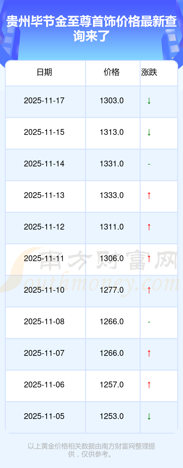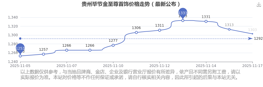 今日贵州毕节金至尊首饰价格最新为:1303.0元/克。