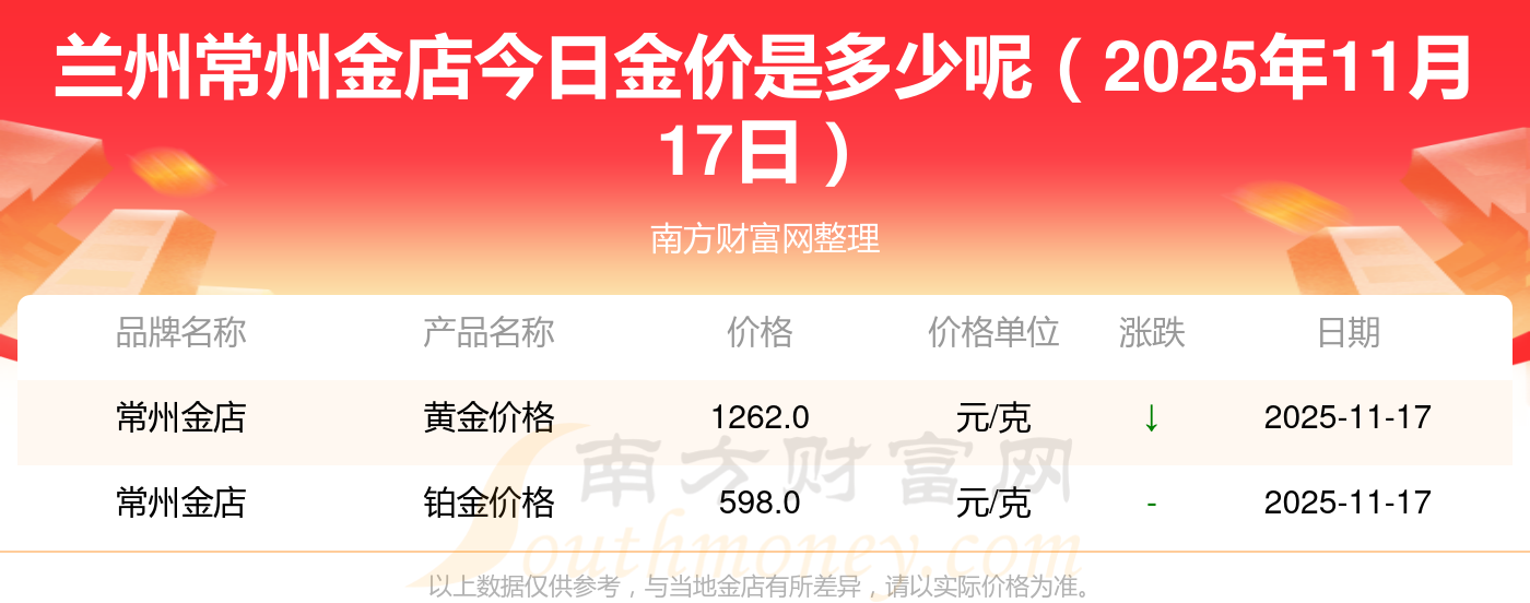 今日黄金价格查询_现在金价黄金一克多少钱,黄金价格是多少钱一克?2025年11月17日兰州常州金店今日价格:金饰价格(内地)1305.0元/克,黄金饰品(香港)46270.0,铂金饰品(香港)13490.0,金条金价(香港)41990.0,投资金条1280.0元/克,工艺金条1295.0元/克,千足金首饰1285.0元/克,投资银条11.5元/克,黄金回购921.0元/克,白银回购10.7元/克,千足金饰品1256.0元/克。