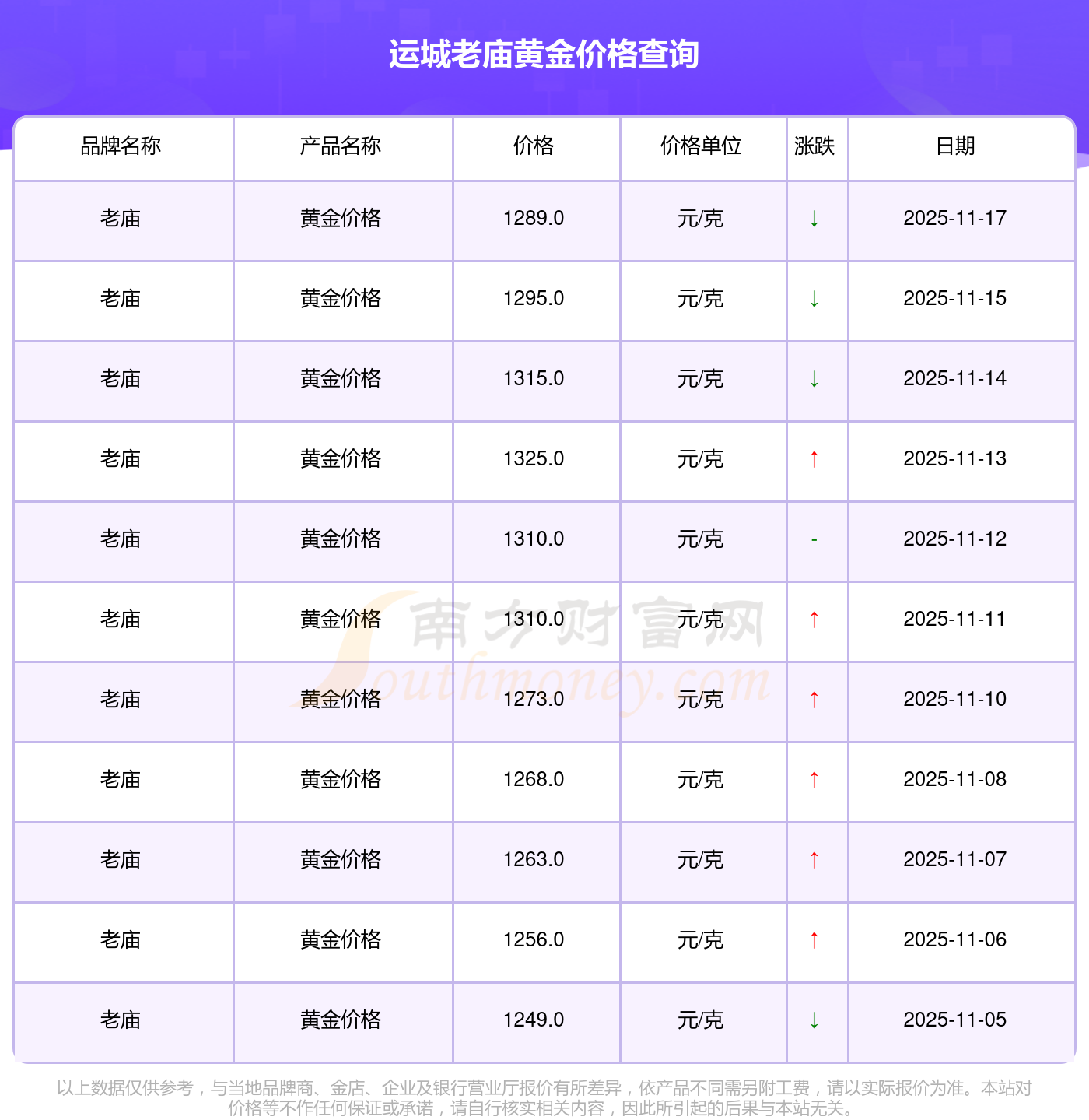 今日(2025年11月17日)运城老庙黄金价格:1289.0元/克。