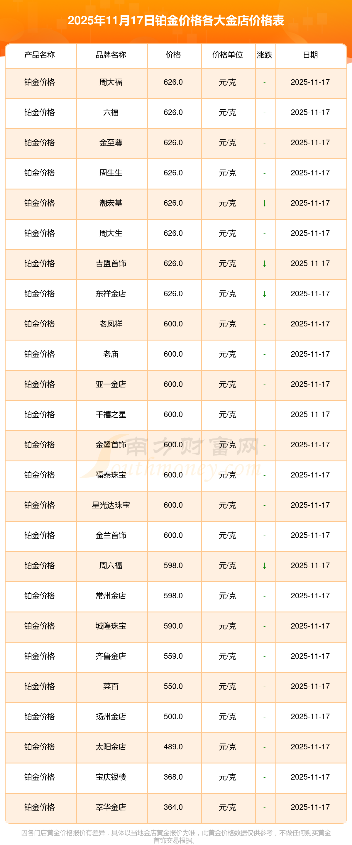 今日铂金价格最高的金店是周大福,报价626.0元/克,铂金价格最低的金店是萃华金店,报价364.0元/克。今日铂金价格高低差为262元/克。