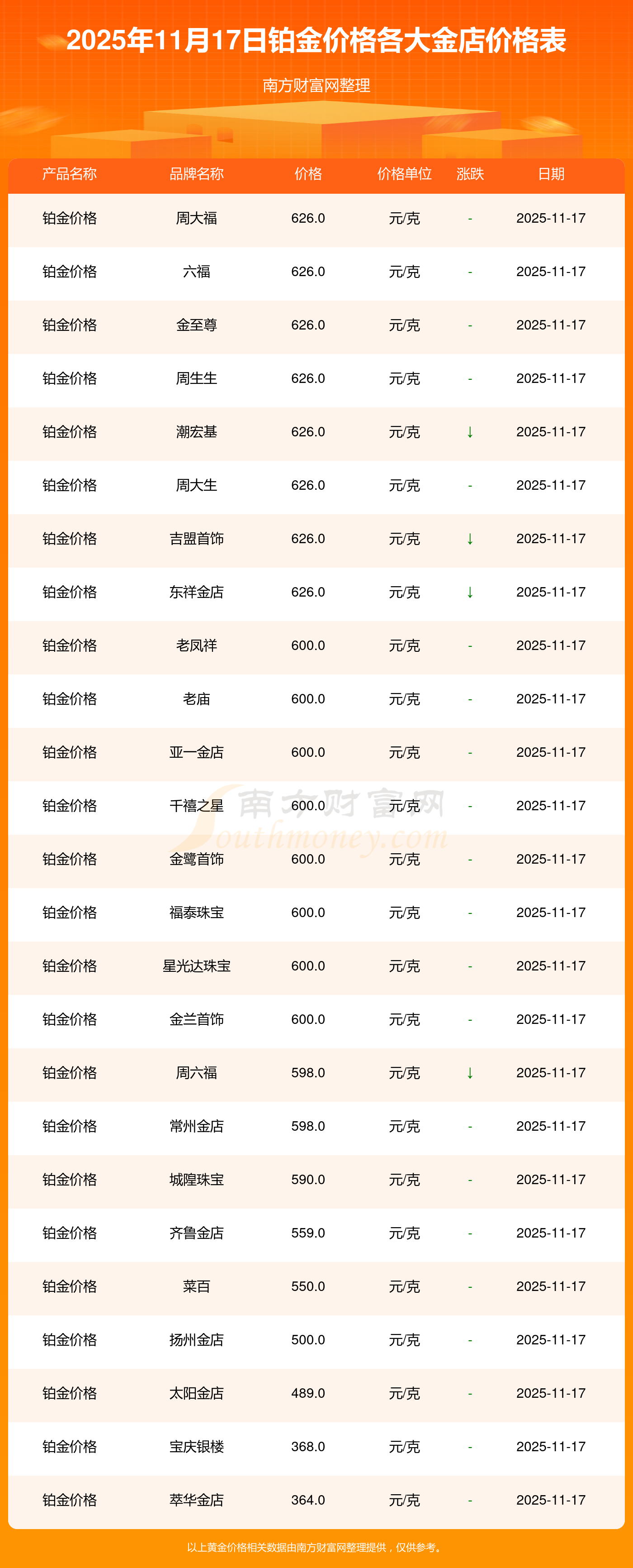 今天是2025年11月17日,谢瑞麟、谢瑞麟、谢瑞麟、谢瑞麟、金银街、金银街、金银街、金银街、金银街、金银街、多边金都珠宝等各大金店品牌铂金价格最新价格如下:谢瑞麟1305.0元/克、谢瑞麟46270.0、谢瑞麟13490.0、谢瑞麟41990.0、金银街1280.0元/克、金银街1295.0元/克、金银街1285.0元/克、金银街11.5元/克、金银街921.0元/克、金银街10.7元/克、多边金都珠宝1256.0元/克。