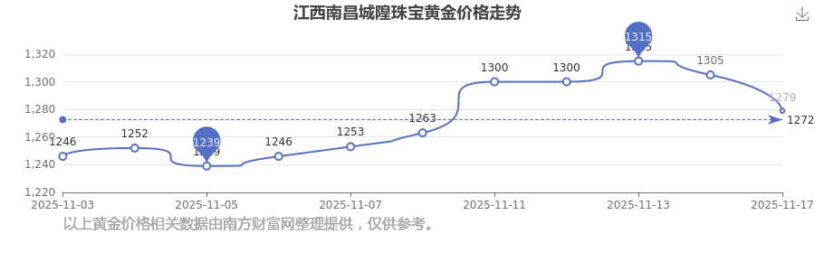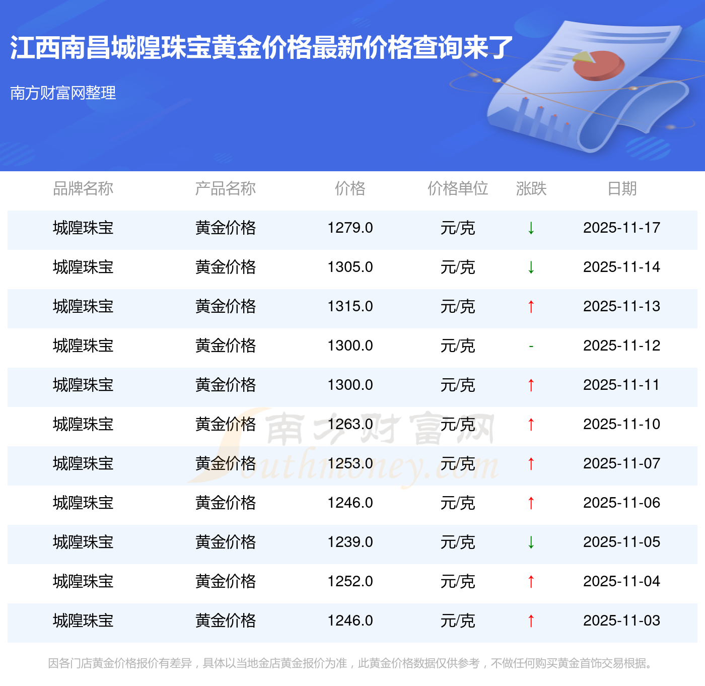 2025年11月17日,江西南昌城隍珠宝黄金价格每克的售卖价位为1279.0元/克。