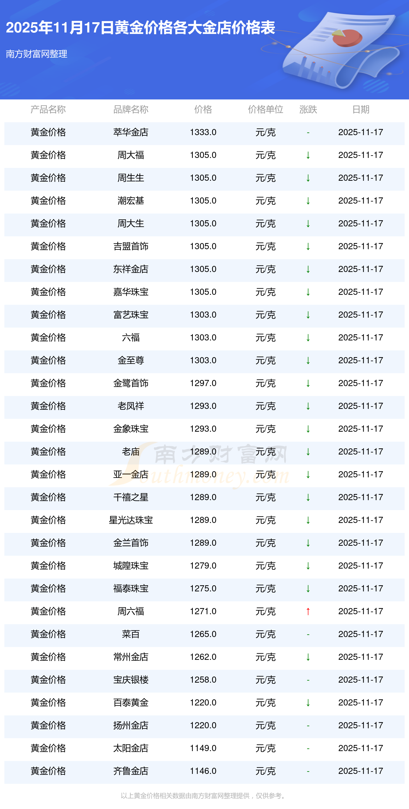 今天是2025年11月17日,谢瑞麟、谢瑞麟、谢瑞麟、谢瑞麟、金银街、金银街、金银街、金银街、金银街、金银街、多边金都珠宝等各大金店品牌黄金价格最新价格如下:谢瑞麟1305.0元/克、谢瑞麟46270.0、谢瑞麟13490.0、谢瑞麟41990.0、金银街1280.0元/克、金银街1295.0元/克、金银街1285.0元/克、金银街11.5元/克、金银街921.0元/克、金银街10.7元/克、多边金都珠宝1256.0元/克。