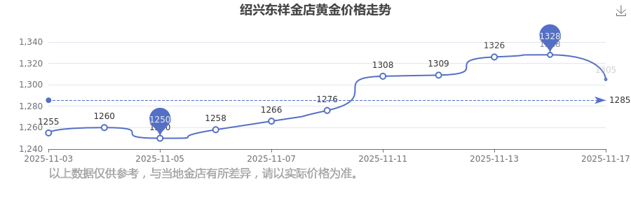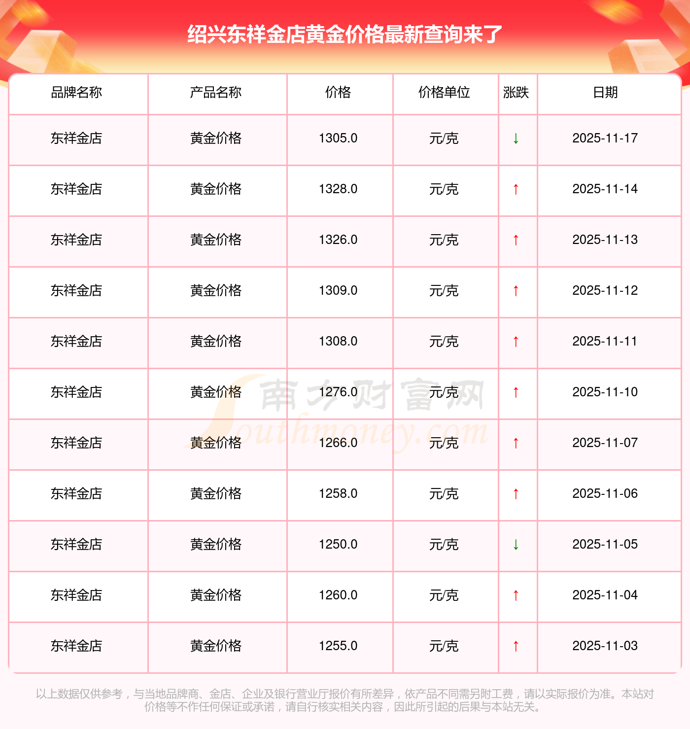绍兴东祥金店在 2025年11月17日,黄金价格的售卖价格是 1305.0元/克。