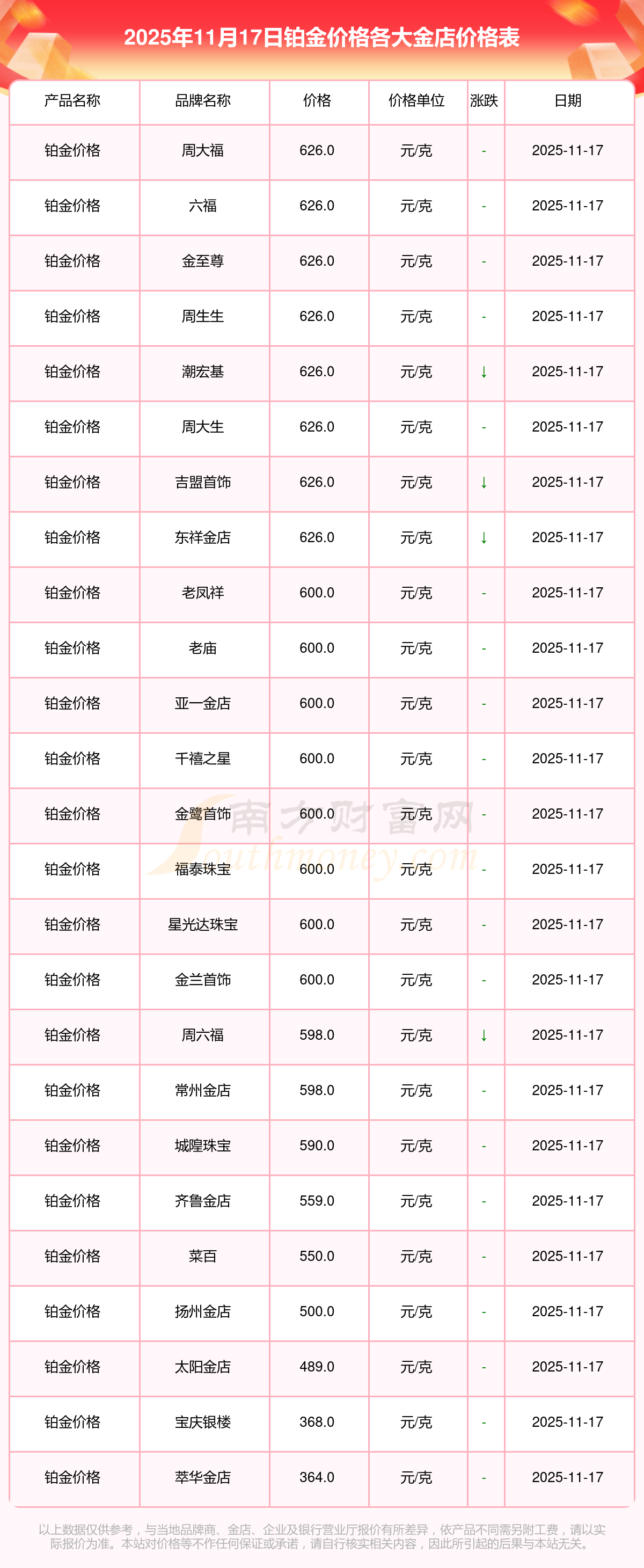 2025年11月17日各金店铂金价格多少?(今日各金店铂金价格最新来了),随小编来看看。
