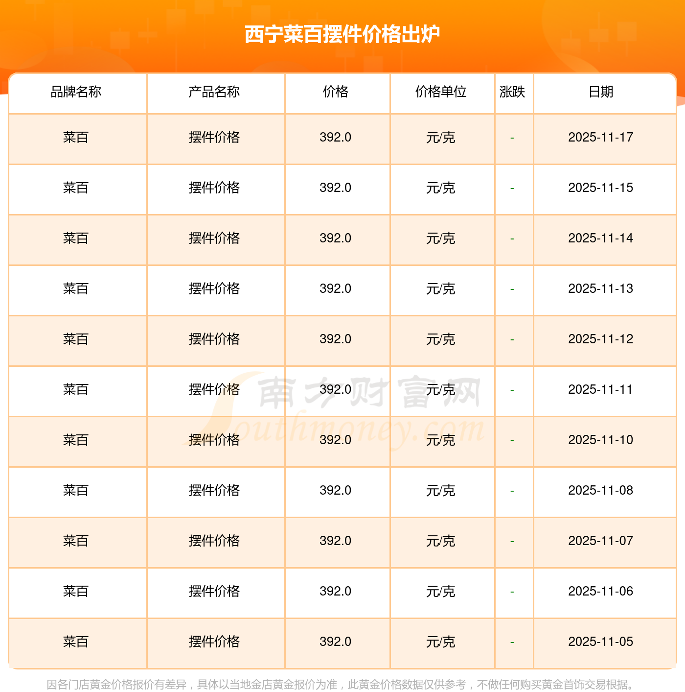 今日2025年11月17日,西宁菜百摆件价格为392.0元/克。