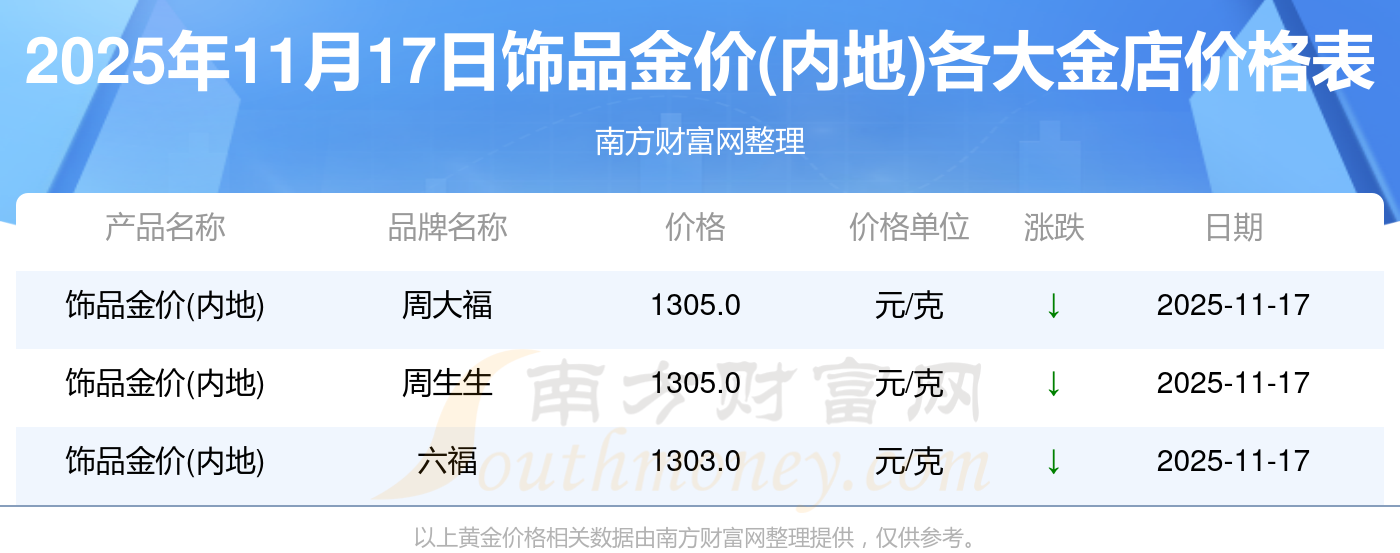 2025年11月17日各大金店饰品金价(内地)最新价格:谢瑞麟1305.0元/克,谢瑞麟46270.0,谢瑞麟13490.0,谢瑞麟41990.0,金银街1280.0元/克,金银街1295.0元/克,金银街1285.0元/克,金银街11.5元/克,金银街921.0元/克,金银街10.7元/克,多边金都珠宝1256.0元/克。