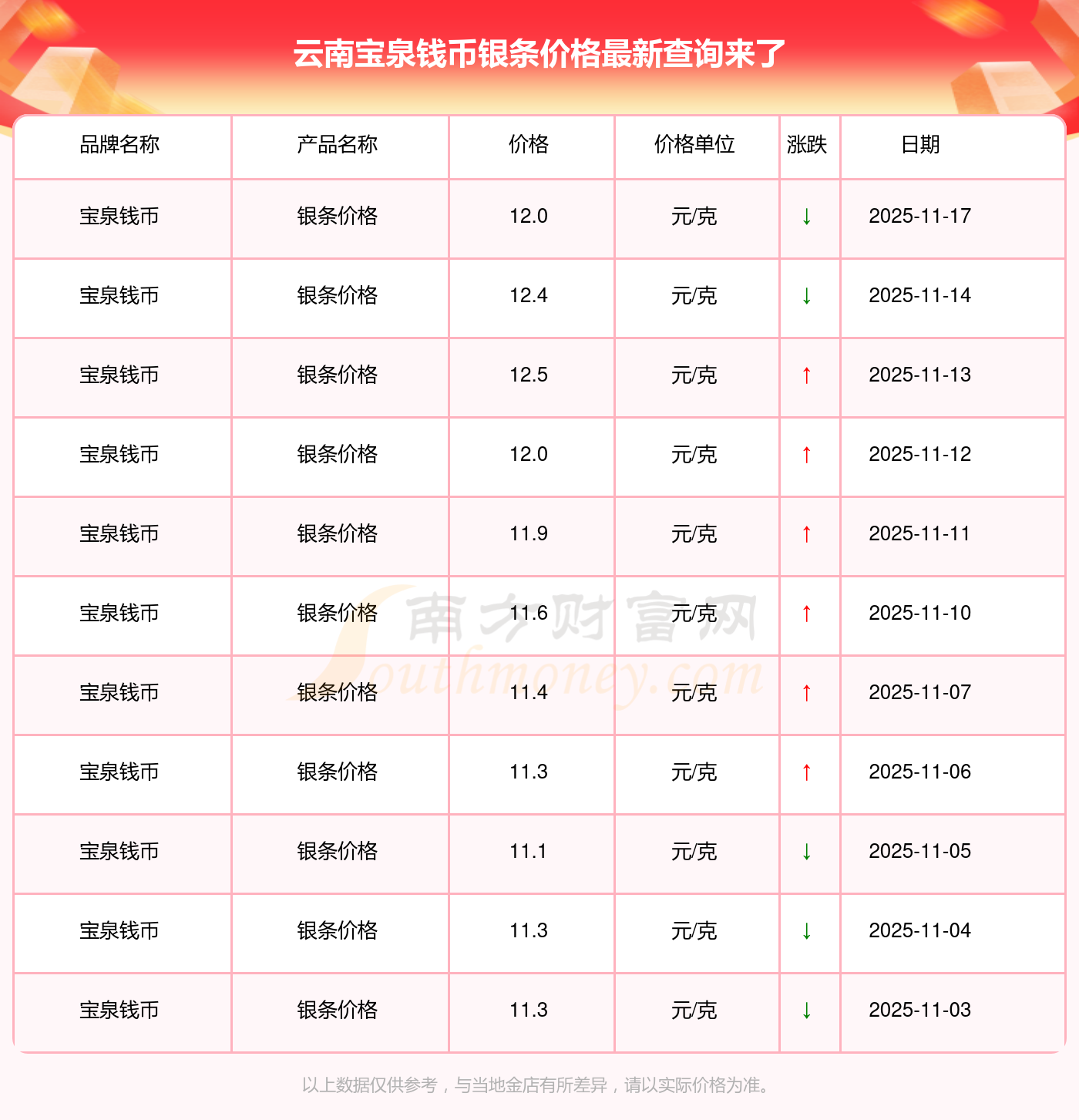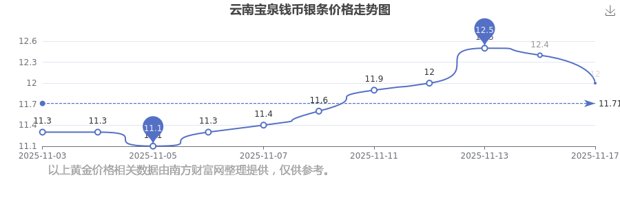 云南宝泉钱币银条价格在 2025年11月17日为 12.0元/克。