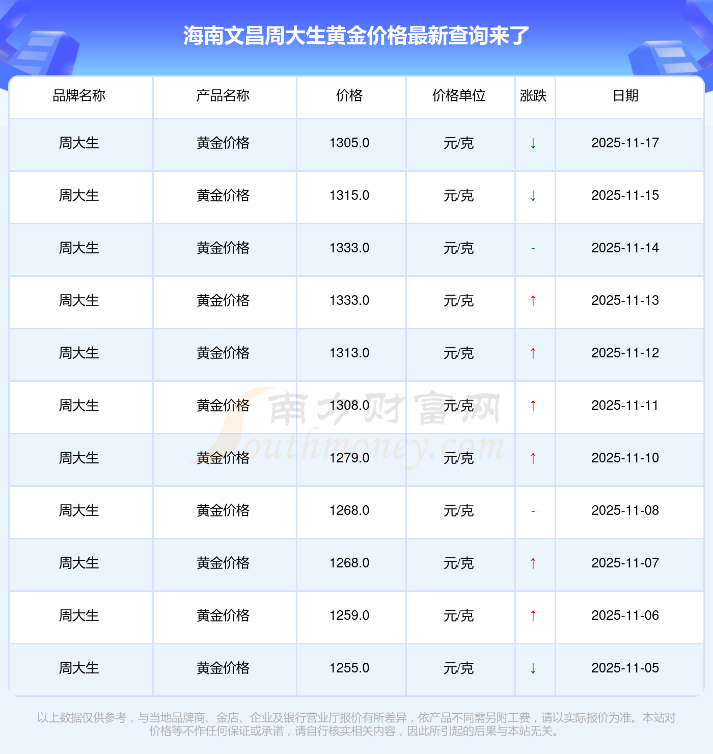 当下一克黄金售价几何?今日海南文昌周大生黄金价格查询,2025年11月17日,海南文昌周大生的黄金价格标价达到 1305.0元/克。