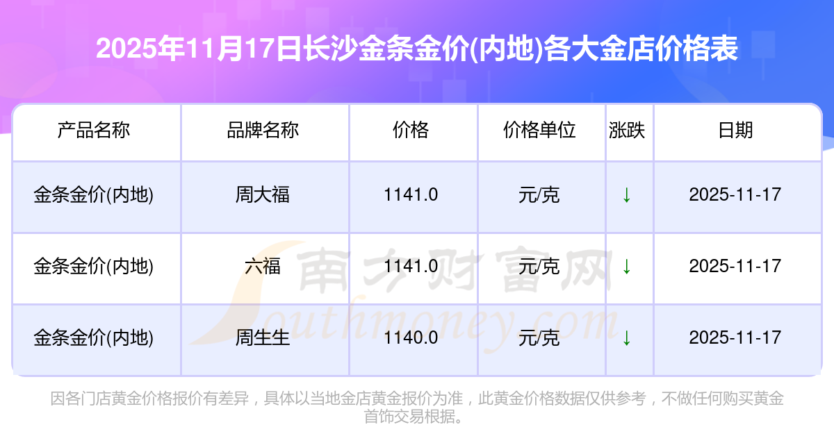 二、2025年11月17日今日长沙各金店金条金价(内地)实时行情汇总