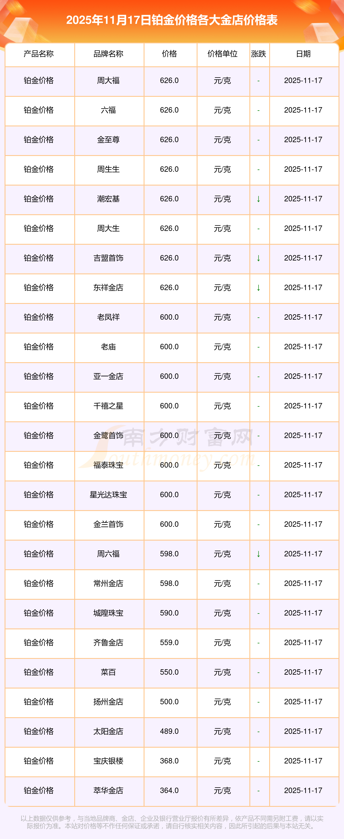 今天是2025年11月17日,谢瑞麟、谢瑞麟、谢瑞麟、谢瑞麟、金银街、金银街、金银街、金银街、金银街、金银街、多边金都珠宝等各大金店品牌铂金价格最新价格如下:谢瑞麟1305.0元/克、谢瑞麟46270.0、谢瑞麟13490.0、谢瑞麟41990.0、金银街1280.0元/克、金银街1295.0元/克、金银街1285.0元/克、金银街11.5元/克、金银街921.0元/克、金银街10.7元/克、多边金都珠宝1256.0元/克。