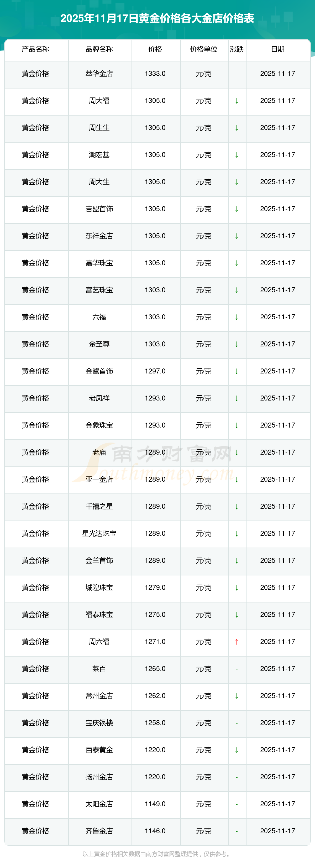 2025年11月17日各金店黄金价格公布_今日黄金价格多少钱一克?