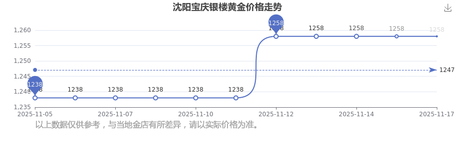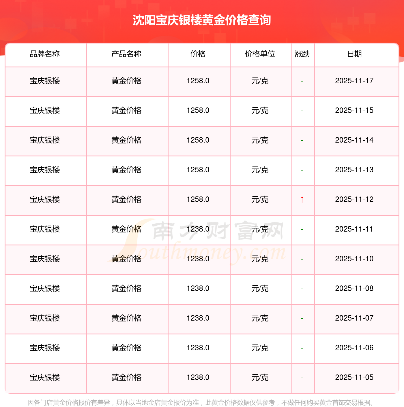 2025年11月17日这一天,沈阳宝庆银楼的黄金价格以 1258.0元/克的价格售卖。