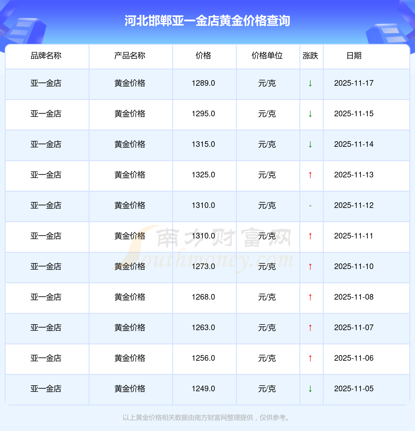 2025年11月17日,谢瑞麟、谢瑞麟、谢瑞麟、谢瑞麟、金银街、金银街、金银街、金银街、金银街、金银街、多边金都珠宝等各大金店品牌黄金价格今日价格如下:谢瑞麟1305.0元/克、谢瑞麟46270.0、谢瑞麟13490.0、谢瑞麟41990.0、金银街1280.0元/克、金银街1295.0元/克、金银街1285.0元/克、金银街11.5元/克、金银街921.0元/克、金银街10.7元/克、多边金都珠宝1256.0元/克。