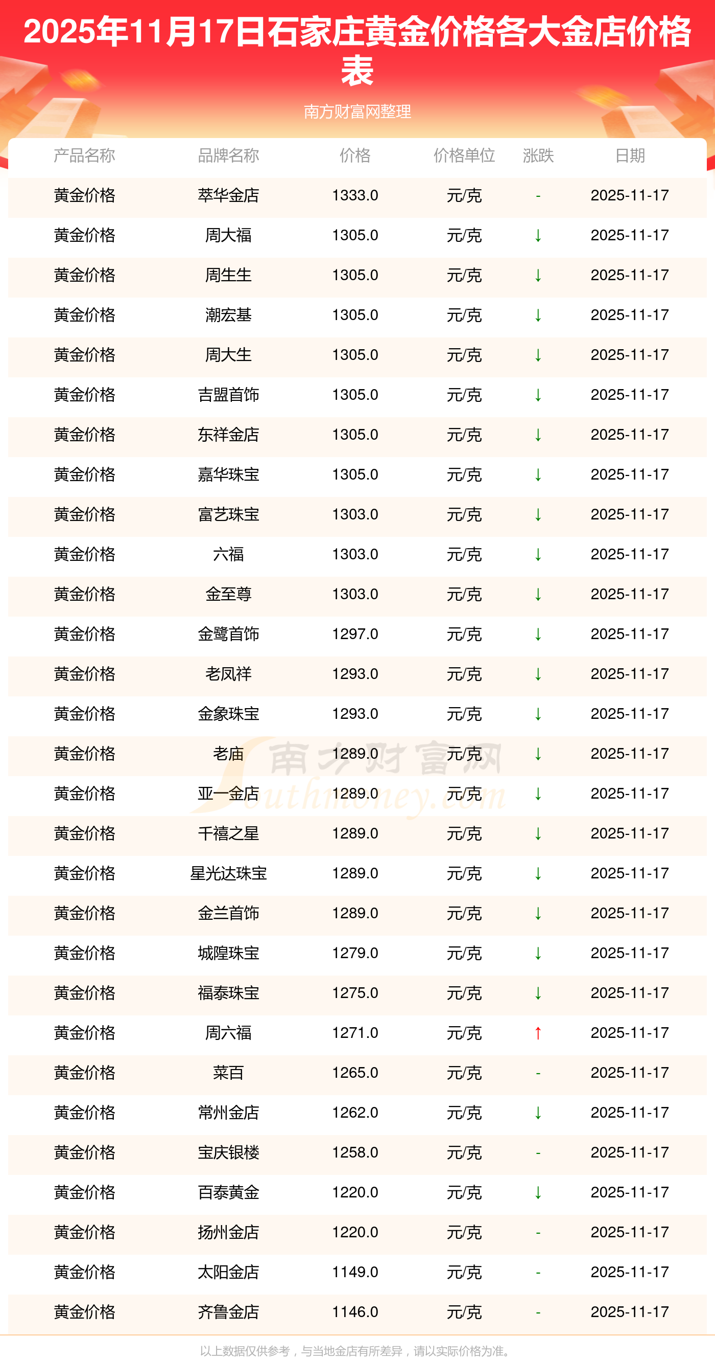 2025年11月17日石家庄各大金店黄金价格最新价格:谢瑞麟1305.0元/克,谢瑞麟46270.0,谢瑞麟13490.0,谢瑞麟41990.0,金银街1280.0元/克,金银街1295.0元/克,金银街1285.0元/克,金银街11.5元/克,金银街921.0元/克,金银街10.7元/克,多边金都珠宝1256.0元/克。