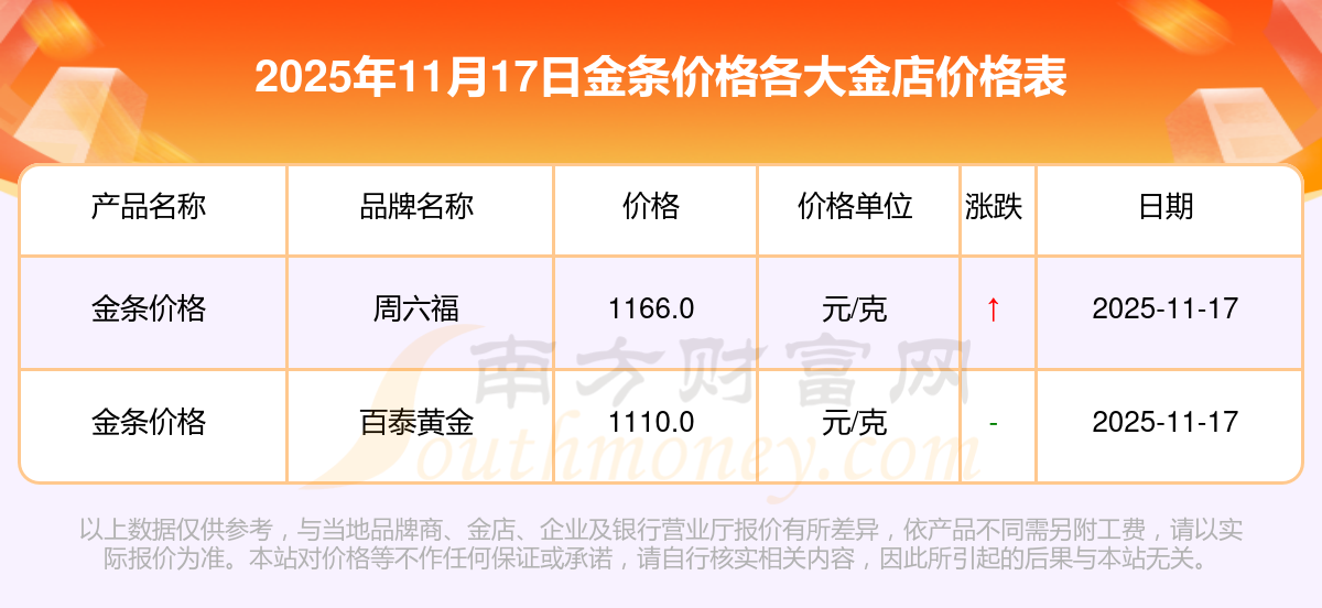 今日金条价格报价最高的金店是周六福,为1166.0元/克,报价最低的金店是百泰黄金,为1110.0元/克。今日金条价格高低差为56元/克。