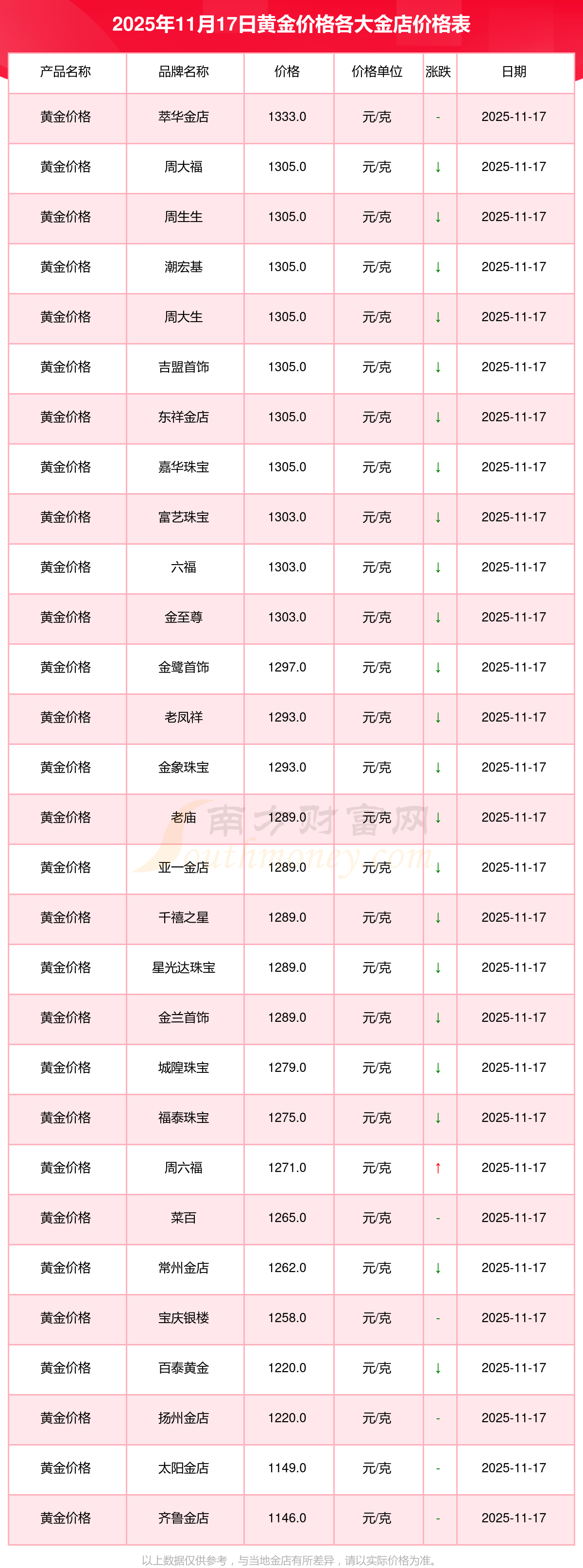 2025年11月17日各大金店黄金价格每克多少钱?各大金店黄金价格表公布,每家金店的黄金价格之所以不一样,黄金基础价格是由国际黄金市场的供求关系和价格波动所定的。金店会根据国际金价的变化来制定和调整金饰的价格。接下来随小编来看看今日市场行情。