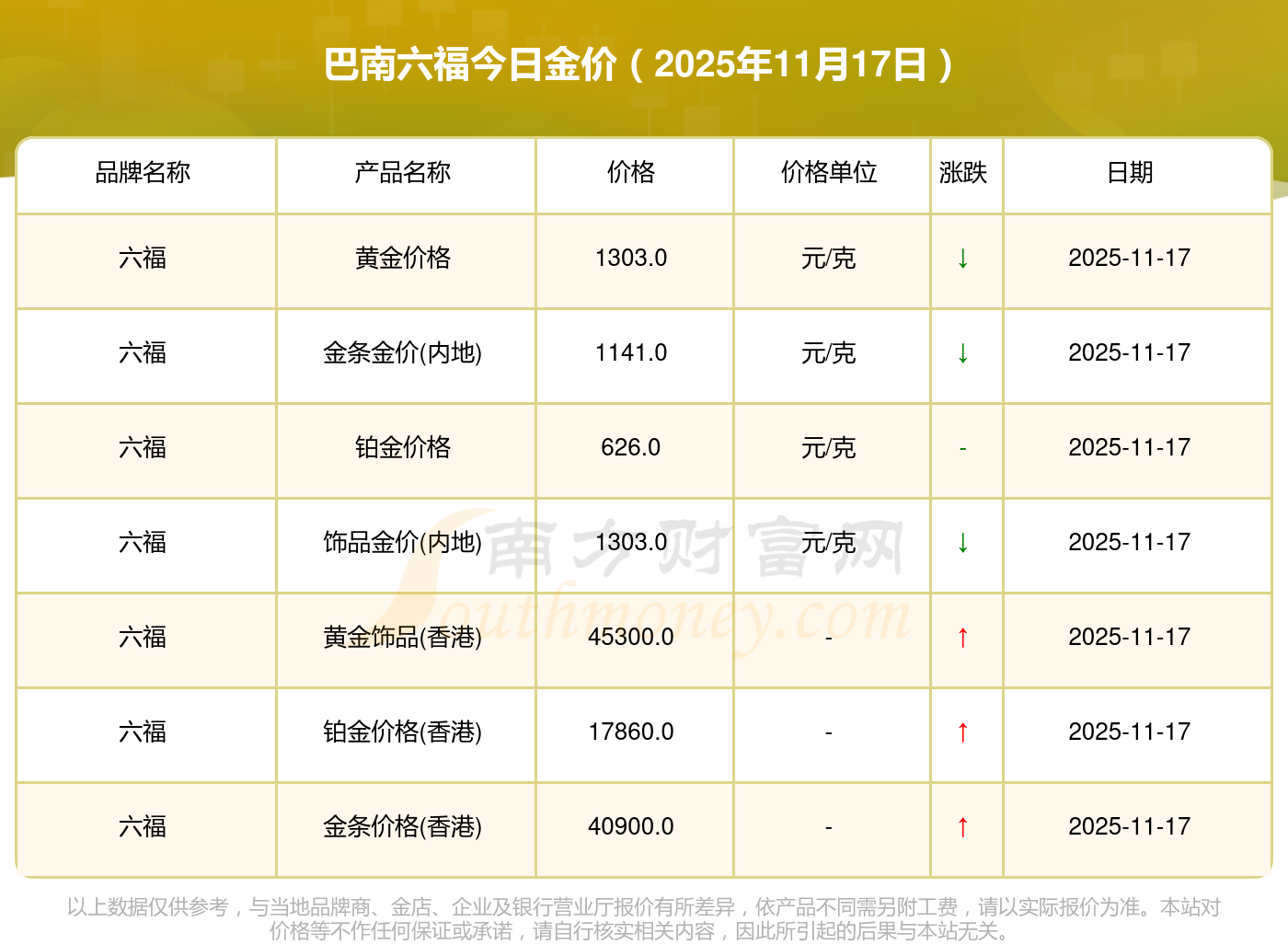 今日黄金价格情况如何?此刻黄金一克要多少钱?2025年11月17日巴南六福最新价格:金饰价格(内地)1305.0元/克,黄金饰品(香港)46270.0,铂金饰品(香港)13490.0,金条金价(香港)41990.0,投资金条1280.0元/克,工艺金条1295.0元/克,千足金首饰1285.0元/克,投资银条11.5元/克,黄金回购921.0元/克,白银回购10.7元/克,千足金饰品1256.0元/克。