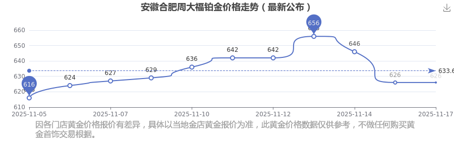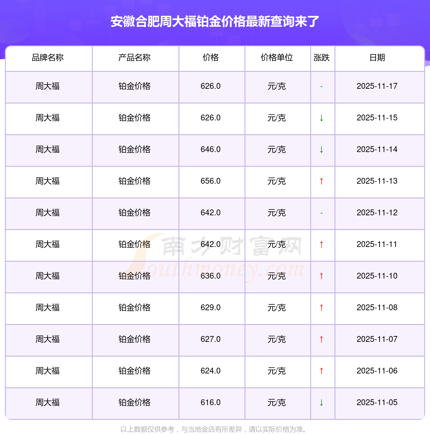 今日安徽合肥周大福铂金价格为626.0元/克。