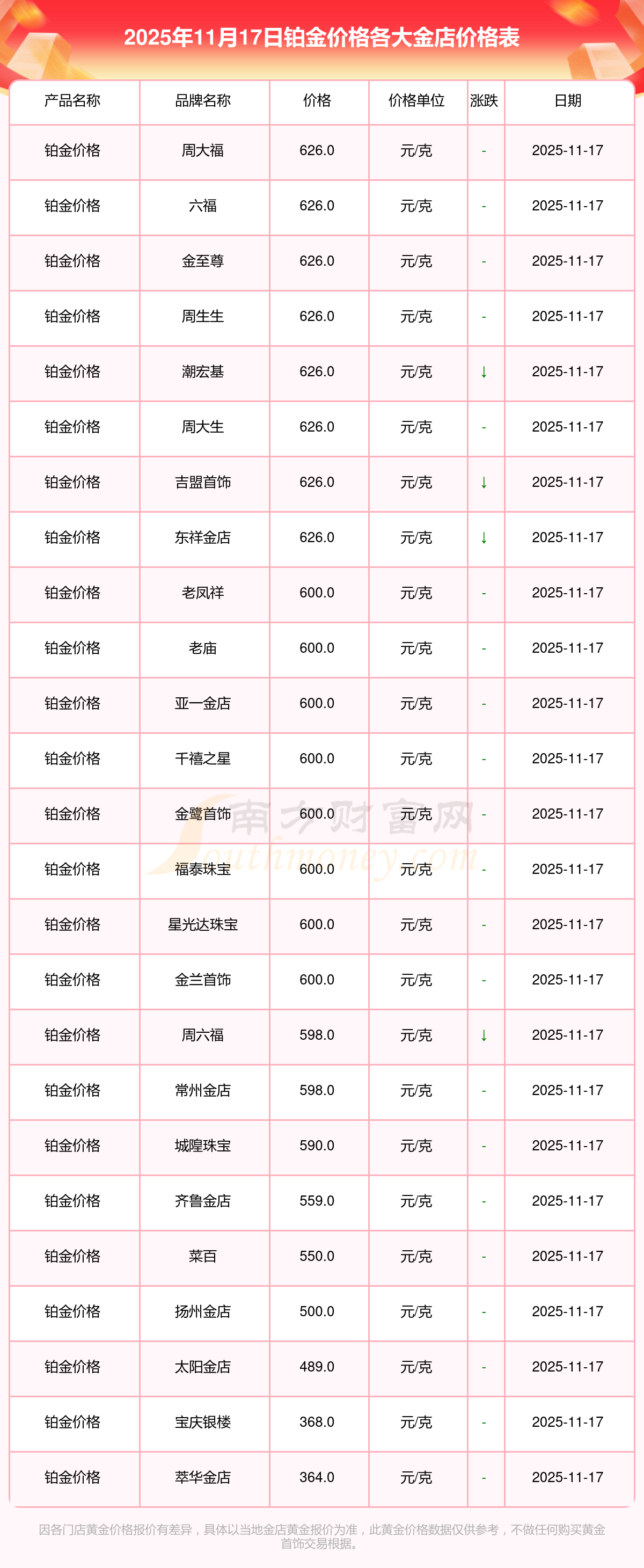 2025年11月17日谢瑞麟、谢瑞麟、谢瑞麟、谢瑞麟、金银街、金银街、金银街、金银街、金银街、金银街、多边金都珠宝等各大金店品牌铂金价格最新价格如下:谢瑞麟金饰价格(内地)1305.0元/克,谢瑞麟黄金饰品(香港)46270.0,谢瑞麟铂金饰品(香港)13490.0,谢瑞麟金条金价(香港)41990.0,金银街投资金条1280.0元/克,金银街工艺金条1295.0元/克,金银街千足金首饰1285.0元/克,金银街投资银条11.5元/克,金银街黄金回购921.0元/克,金银街白银回购10.7元/克,多边金都珠宝千足金饰品1256.0元/克。