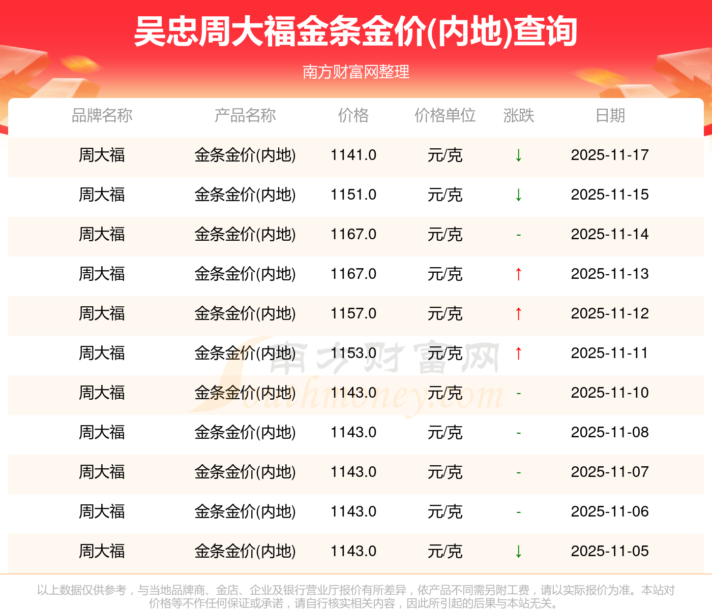 吴忠周大福在 2025年11月17日的金条金价(内地)零售价格为 1141.0元/克。