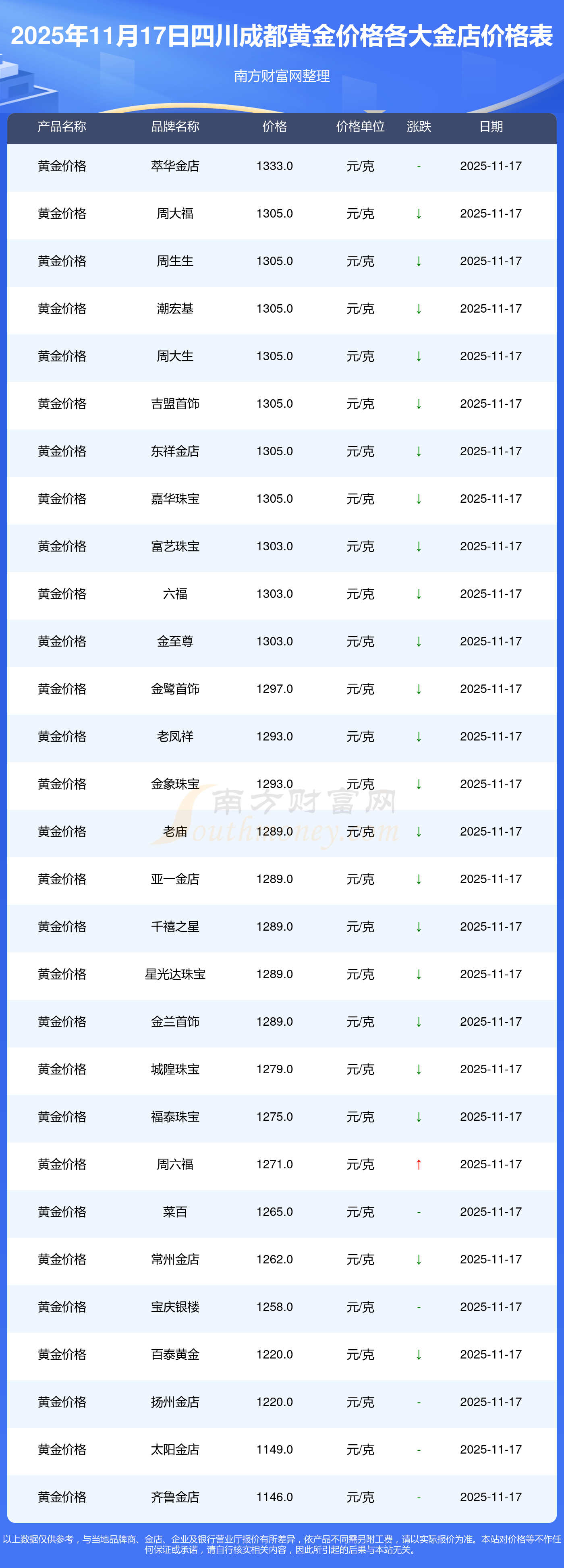2025年11月17日四川成都谢瑞麟、谢瑞麟、谢瑞麟、谢瑞麟、金银街、金银街、金银街、金银街、金银街、金银街、多边金都珠宝等各大金店品牌黄金价格最新价格如下:谢瑞麟金饰价格(内地)1305.0元/克,谢瑞麟黄金饰品(香港)46270.0,谢瑞麟铂金饰品(香港)13490.0,谢瑞麟金条金价(香港)41990.0,金银街投资金条1280.0元/克,金银街工艺金条1295.0元/克,金银街千足金首饰1285.0元/克,金银街投资银条11.5元/克,金银街黄金回购921.0元/克,金银街白银回购10.7元/克,多边金都珠宝千足金饰品1256.0元/克。