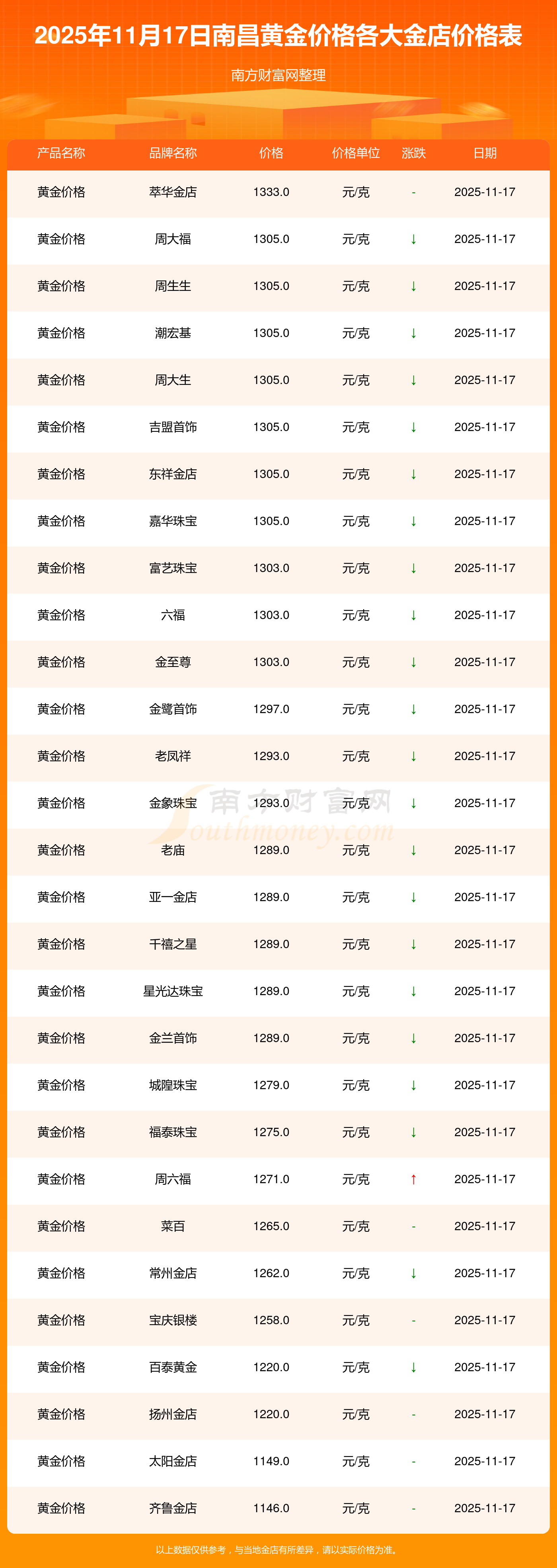 今天是2025年11月17日,南昌谢瑞麟、谢瑞麟、谢瑞麟、谢瑞麟、金银街、金银街、金银街、金银街、金银街、金银街、多边金都珠宝等各大金店品牌黄金价格最新价格行情是这样的:谢瑞麟1305.0元/克、谢瑞麟46270.0、谢瑞麟13490.0、谢瑞麟41990.0、金银街1280.0元/克、金银街1295.0元/克、金银街1285.0元/克、金银街11.5元/克、金银街921.0元/克、金银街10.7元/克、多边金都珠宝1256.0元/克。