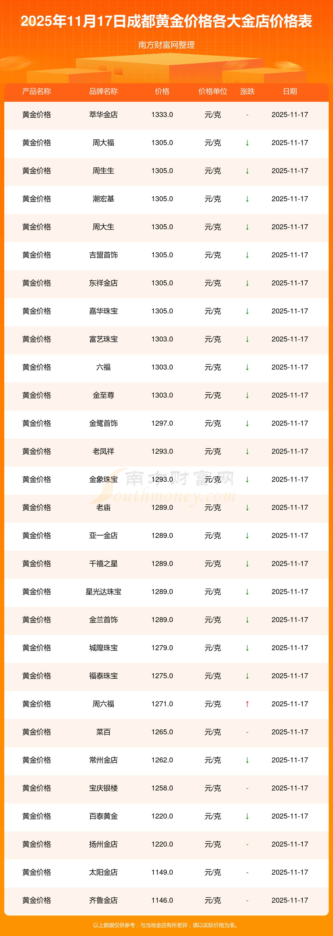 2025年11月17日成都谢瑞麟、谢瑞麟、谢瑞麟、谢瑞麟、金银街、金银街、金银街、金银街、金银街、金银街、多边金都珠宝等各大金店品牌黄金价格最新价格行情来了,如下:谢瑞麟金饰价格(内地)1305.0元/克,谢瑞麟黄金饰品(香港)46270.0,谢瑞麟铂金饰品(香港)13490.0,谢瑞麟金条金价(香港)41990.0,金银街投资金条1280.0元/克,金银街工艺金条1295.0元/克,金银街千足金首饰1285.0元/克,金银街投资银条11.5元/克,金银街黄金回购921.0元/克,金银街白银回购10.7元/克,多边金都珠宝千足金饰品1256.0元/克。
