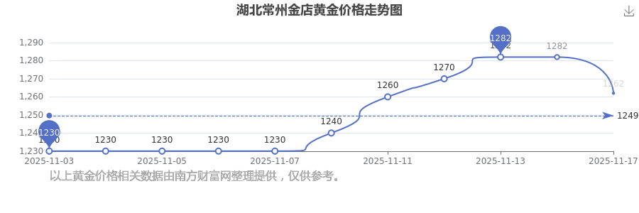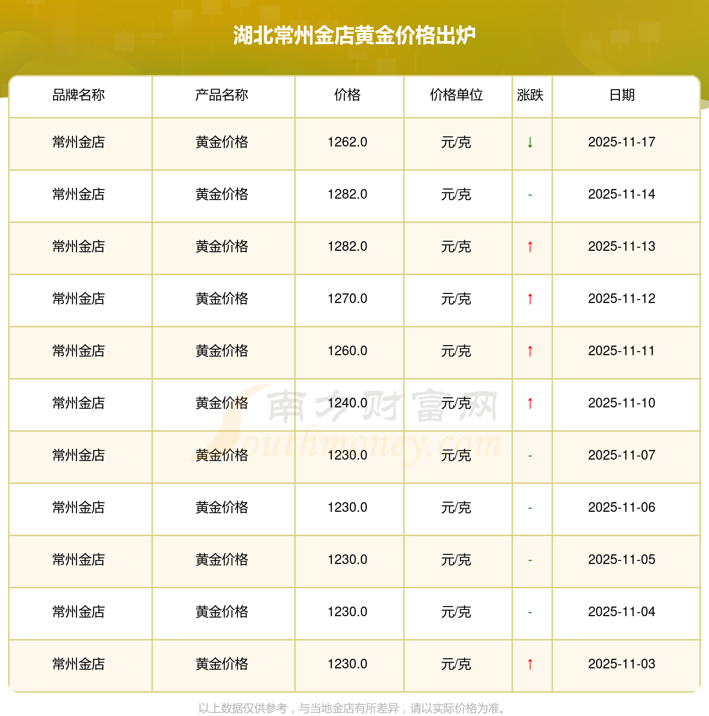 2025年11月17日这一天,湖北常州金店的黄金价格以 1262.0元/克的价格售卖。