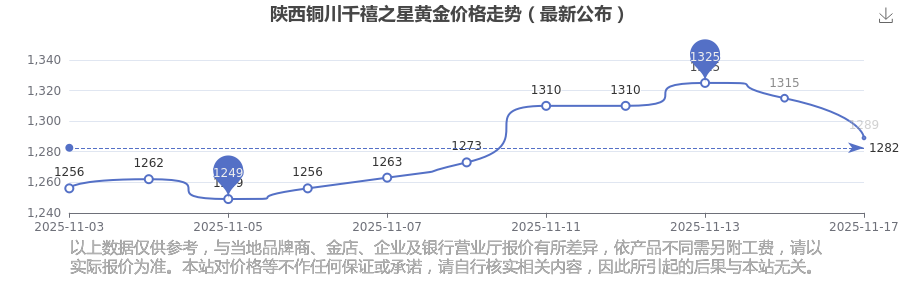 今日陕西铜川千禧之星黄金价格最新为:1289.0元/克。
