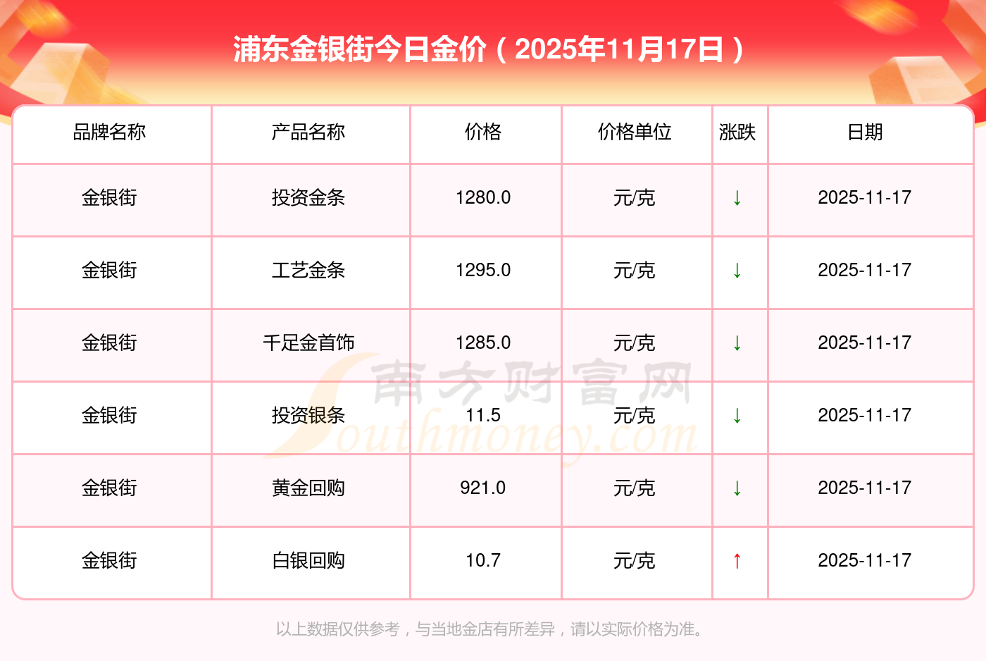2025年11月17日浦东金银街每克黄金的市场价格是多少:金饰价格(内地)1305.0元/克,黄金饰品(香港)46270.0,铂金饰品(香港)13490.0,金条金价(香港)41990.0,投资金条1280.0元/克,工艺金条1295.0元/克,千足金首饰1285.0元/克,投资银条11.5元/克,黄金回购921.0元/克,白银回购10.7元/克,千足金饰品1256.0元/克。