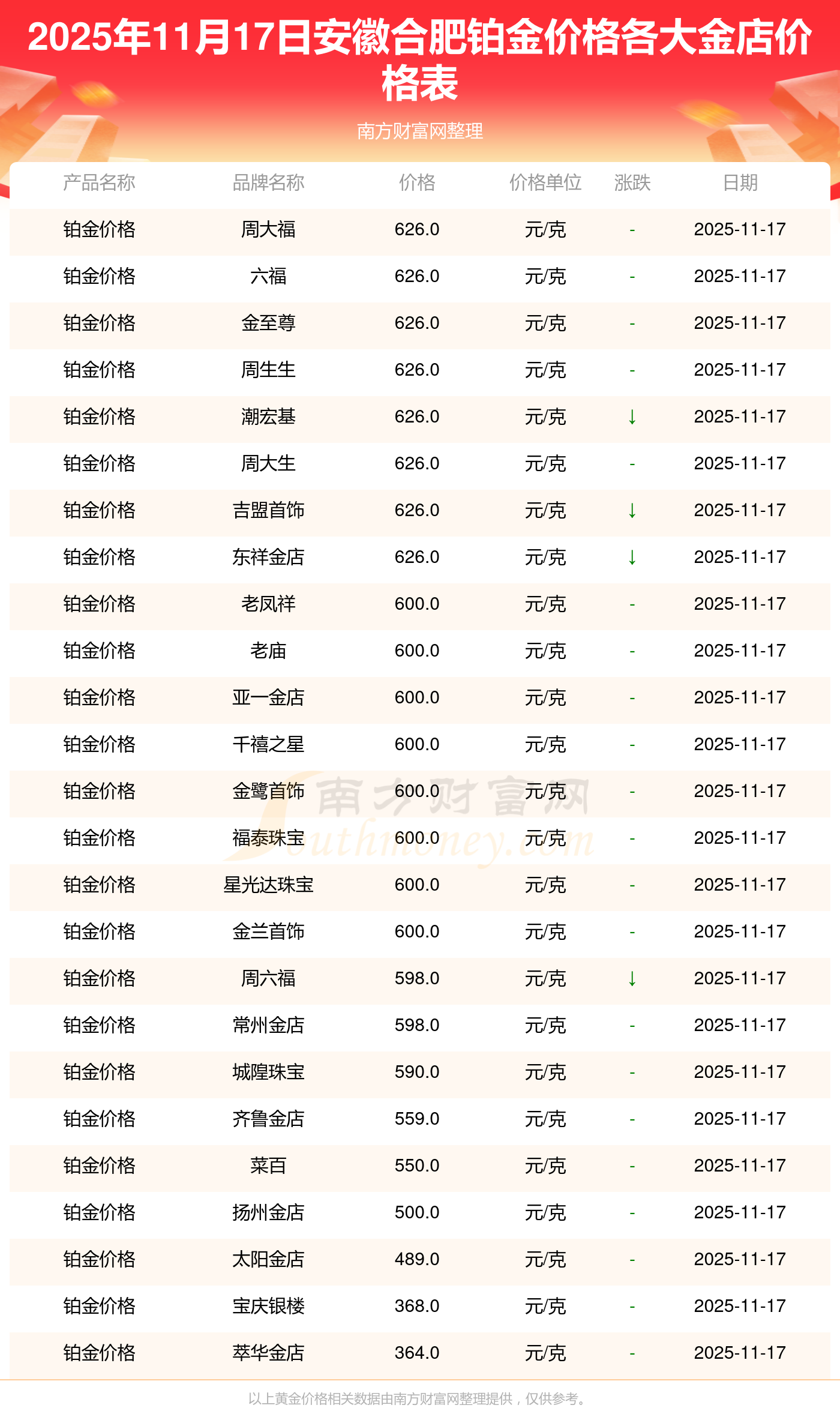 一、2025年11月17日安徽合肥各大金店铂金价格多少一克?安徽合肥铂金价格多少钱一克?