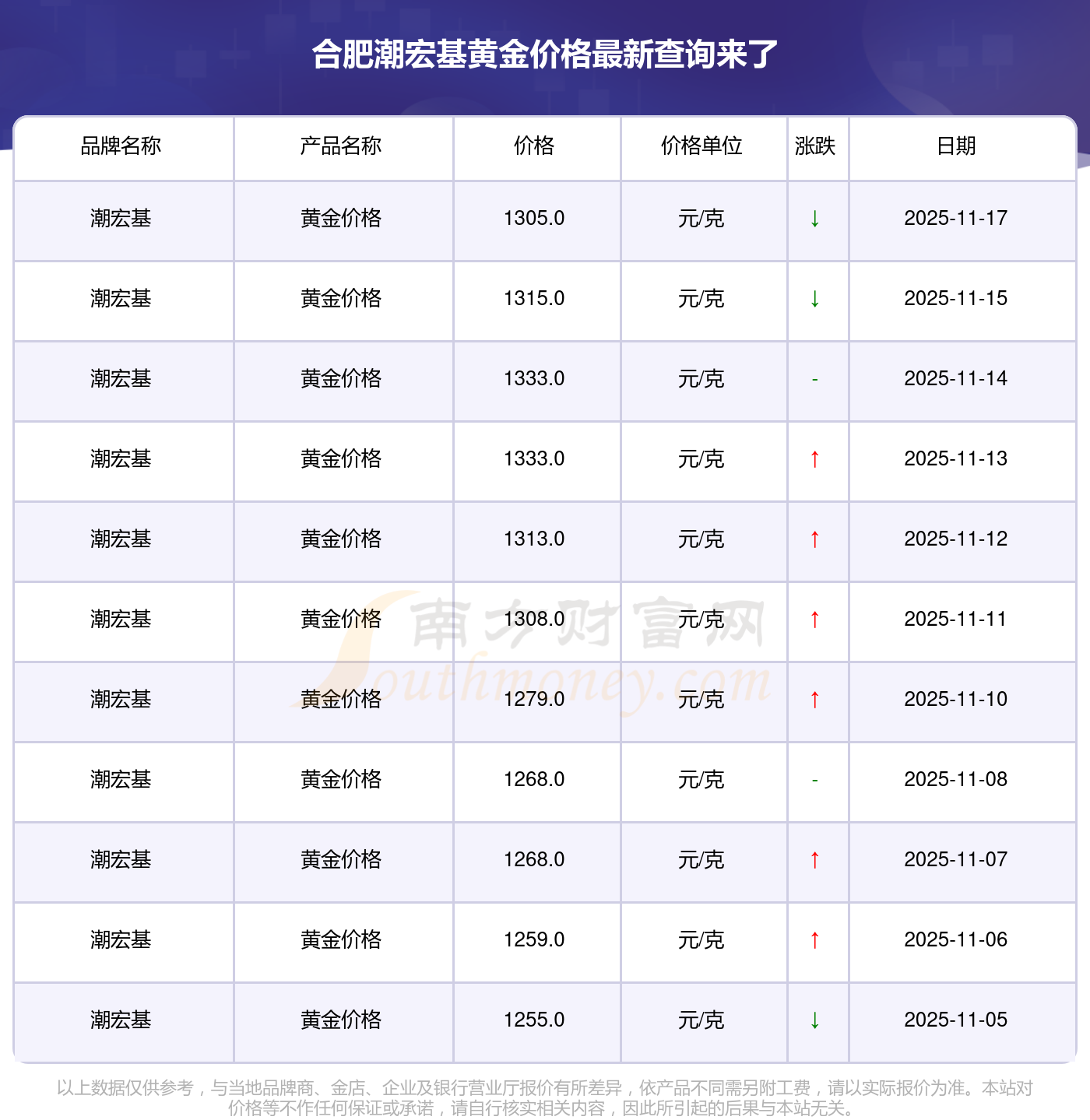 合肥潮宏基黄金价格现在每克多少钱?想知道今日一克黄金的出售价格是多少钱?今日合肥潮宏基黄金价格查询,2025年11月17日当天,合肥潮宏基黄金价格的单价是 1305.0元/克。