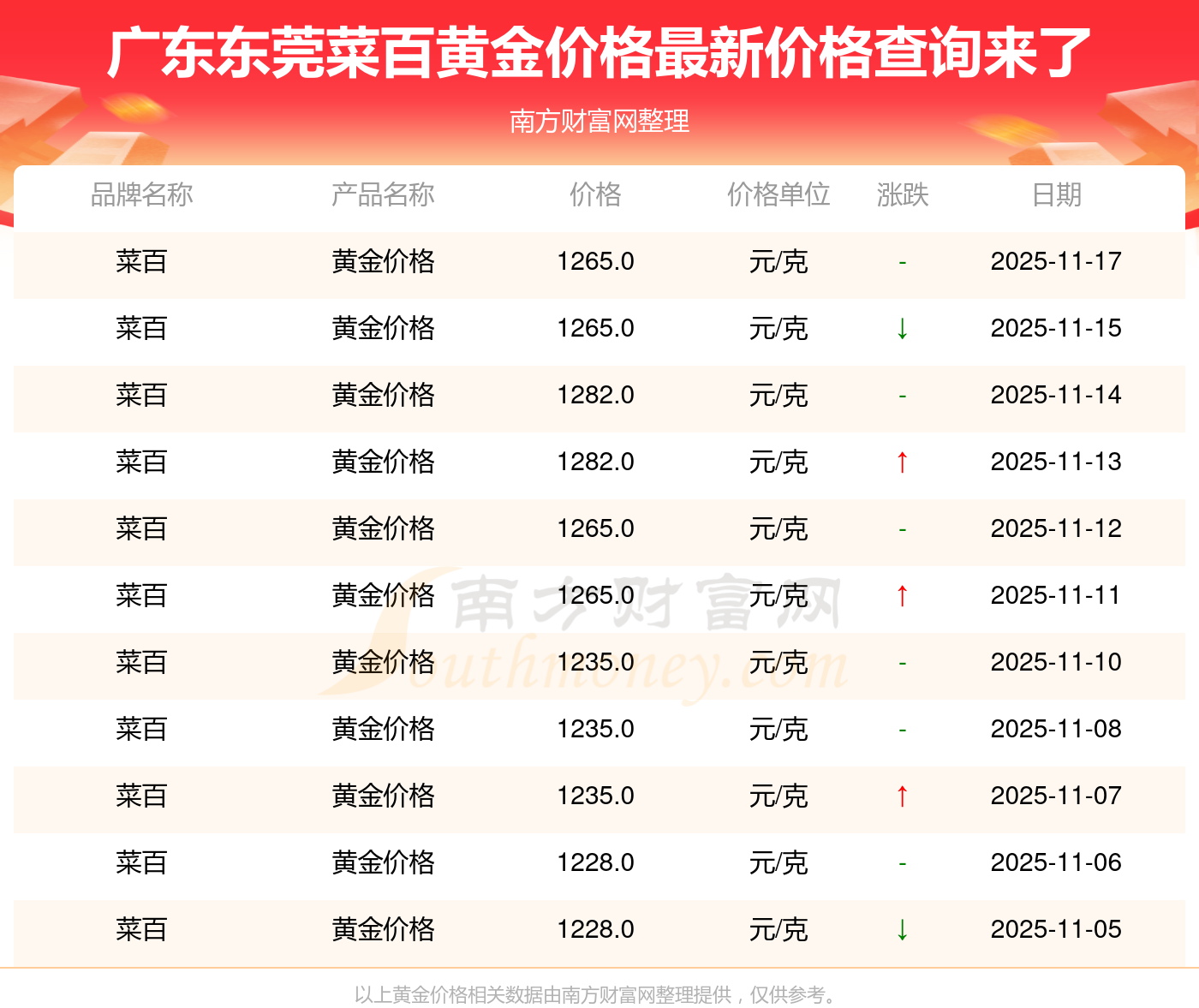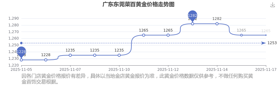 广东东莞菜百的黄金价格在今日(2025年11月17日),每克售价为1265.0元/克。