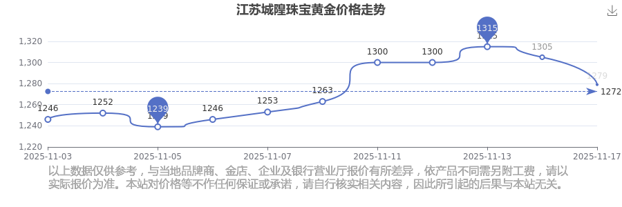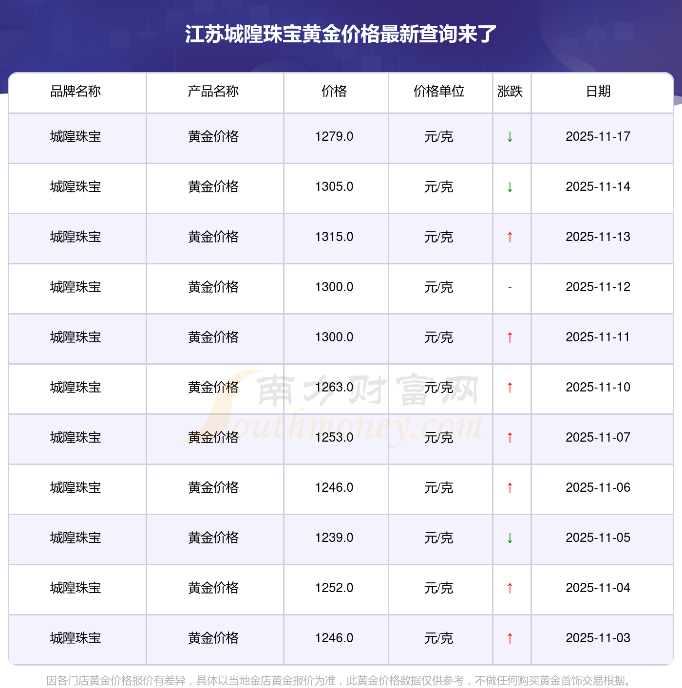2025年11月17日这一天,江苏城隍珠宝的黄金价格以 1279.0元/克的价格售卖。