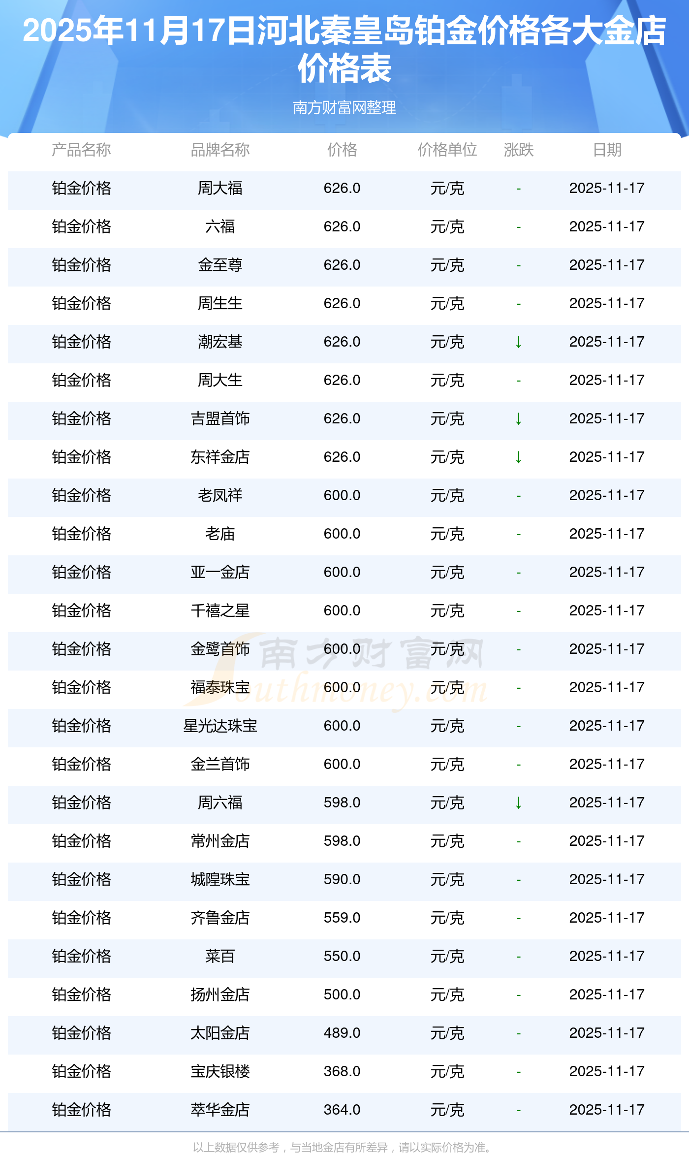 2025年11月17日河北秦皇岛各大金店铂金价格最新价格:谢瑞麟1305.0元/克,谢瑞麟46270.0,谢瑞麟13490.0,谢瑞麟41990.0,金银街1280.0元/克,金银街1295.0元/克,金银街1285.0元/克,金银街11.5元/克,金银街921.0元/克,金银街10.7元/克,多边金都珠宝1256.0元/克。