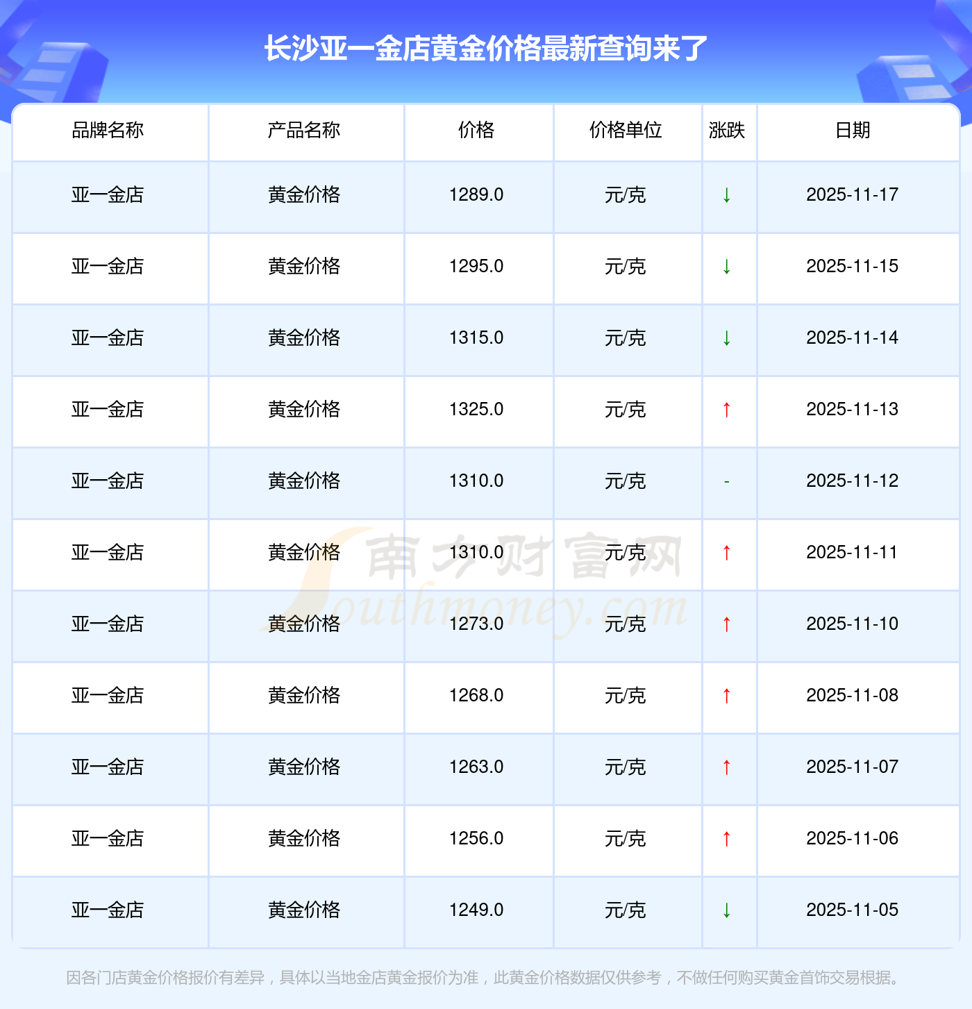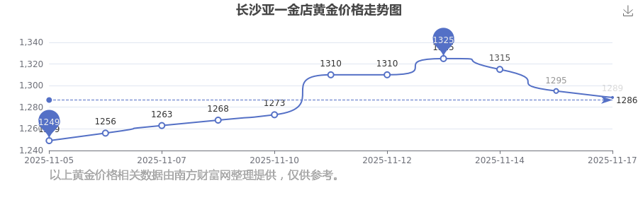 2025年11月17日长沙亚一金店黄金价格:1289.0元/克。