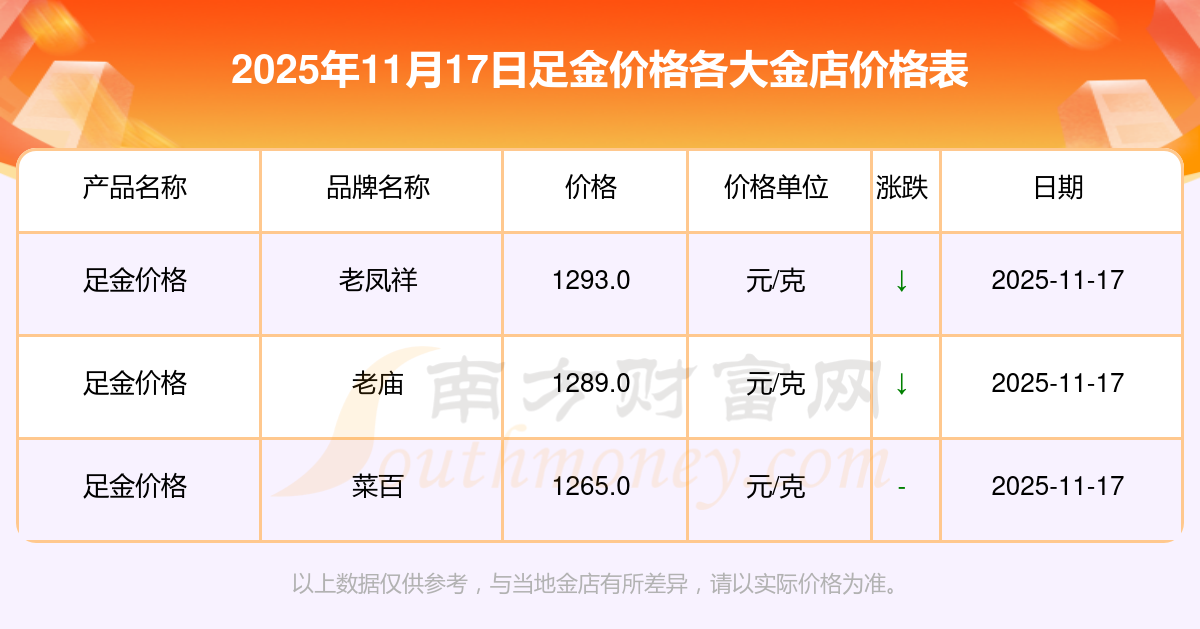 2025年11月17日谢瑞麟、谢瑞麟、谢瑞麟、谢瑞麟、金银街、金银街、金银街、金银街、金银街、金银街、多边金都珠宝等各大金店品牌足金价格最新价格如下:谢瑞麟金饰价格(内地)1305.0元/克,谢瑞麟黄金饰品(香港)46270.0,谢瑞麟铂金饰品(香港)13490.0,谢瑞麟金条金价(香港)41990.0,金银街投资金条1280.0元/克,金银街工艺金条1295.0元/克,金银街千足金首饰1285.0元/克,金银街投资银条11.5元/克,金银街黄金回购921.0元/克,金银街白银回购10.7元/克,多边金都珠宝千足金饰品1256.0元/克。