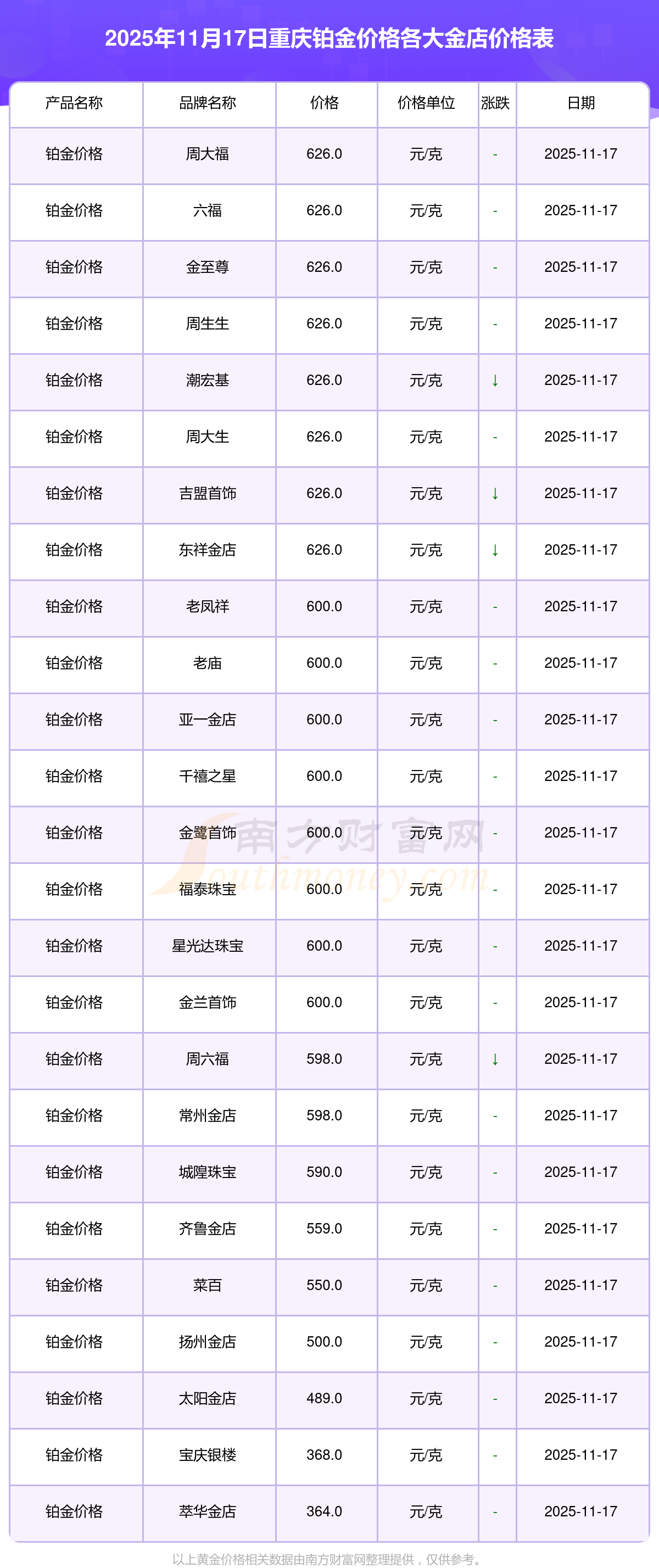 2025年11月17日,重庆谢瑞麟、谢瑞麟、谢瑞麟、谢瑞麟、金银街、金银街、金银街、金银街、金银街、金银街、多边金都珠宝等各大金店品牌铂金价格今日价格如下:谢瑞麟1305.0元/克、谢瑞麟46270.0、谢瑞麟13490.0、谢瑞麟41990.0、金银街1280.0元/克、金银街1295.0元/克、金银街1285.0元/克、金银街11.5元/克、金银街921.0元/克、金银街10.7元/克、多边金都珠宝1256.0元/克。