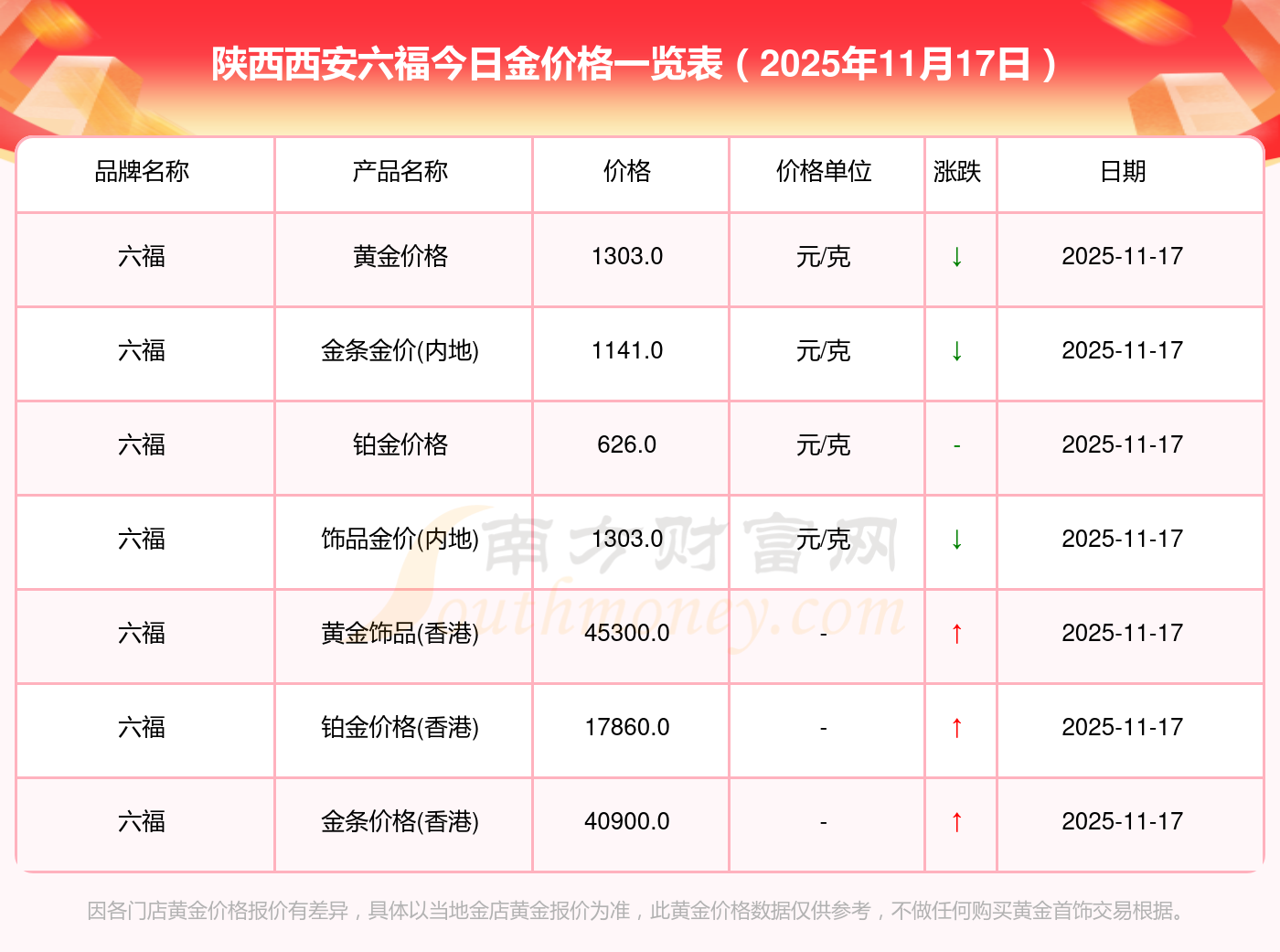 2025年11月17日陕西西安六福今日价格:金饰价格(内地)1305.0元/克,黄金饰品(香港)46270.0,铂金饰品(香港)13490.0,金条金价(香港)41990.0,投资金条1280.0元/克,工艺金条1295.0元/克,千足金首饰1285.0元/克,投资银条11.5元/克,黄金回购921.0元/克,白银回购10.7元/克,千足金饰品1256.0元/克。