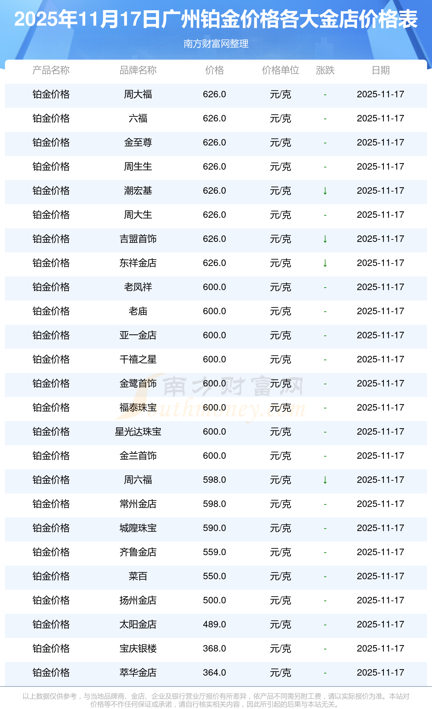 2025年11月17日,广州谢瑞麟、谢瑞麟、谢瑞麟、谢瑞麟、金银街、金银街、金银街、金银街、金银街、金银街、多边金都珠宝等各大金店品牌铂金价格今日价格如下:谢瑞麟1305.0元/克、谢瑞麟46270.0、谢瑞麟13490.0、谢瑞麟41990.0、金银街1280.0元/克、金银街1295.0元/克、金银街1285.0元/克、金银街11.5元/克、金银街921.0元/克、金银街10.7元/克、多边金都珠宝1256.0元/克。
