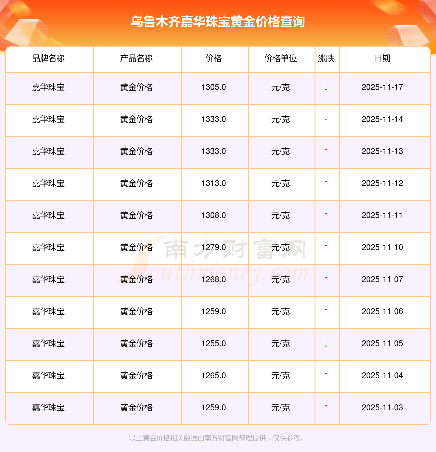 今日乌鲁木齐嘉华珠宝黄金价格公布今天的黄金,以克为单位,其价格是多少今日(2025年11月17日)乌鲁木齐嘉华珠宝黄金价格为1305.0元/克。