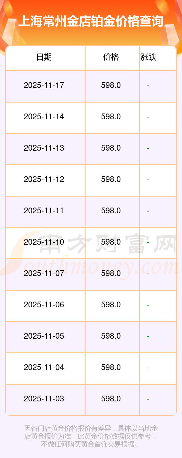 2025年11月17日上海常州金店铂金价格:598.0元/克。