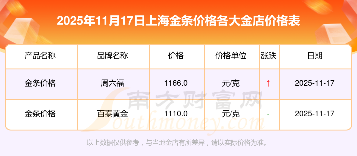 2025年11月17日,上海谢瑞麟、谢瑞麟、谢瑞麟、谢瑞麟、金银街、金银街、金银街、金银街、金银街、金银街、多边金都珠宝等各大金店品牌金条价格今日价格行情最新来了:谢瑞麟1305.0元/克、谢瑞麟46270.0、谢瑞麟13490.0、谢瑞麟41990.0、金银街1280.0元/克、金银街1295.0元/克、金银街1285.0元/克、金银街11.5元/克、金银街921.0元/克、金银街10.7元/克、多边金都珠宝1256.0元/克。