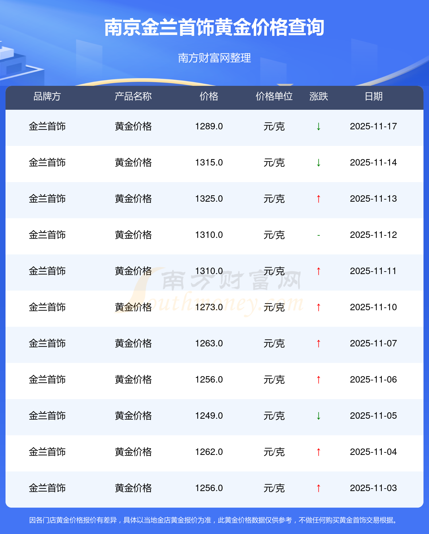 今日南京金兰首饰黄金价格公布请问今天,黄金一克的价位是多少(2025年11月17日)南京金兰首饰黄金价格现在为1289.0元/克。