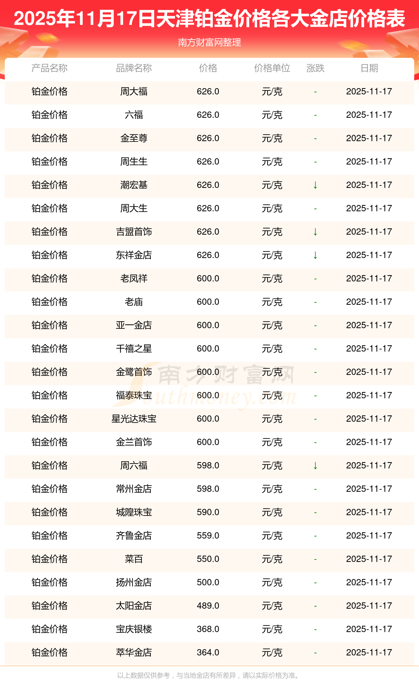 2025年11月17日,天津谢瑞麟、谢瑞麟、谢瑞麟、谢瑞麟、金银街、金银街、金银街、金银街、金银街、金银街、多边金都珠宝等各大金店品牌铂金价格今日价格如下:谢瑞麟1305.0元/克、谢瑞麟46270.0、谢瑞麟13490.0、谢瑞麟41990.0、金银街1280.0元/克、金银街1295.0元/克、金银街1285.0元/克、金银街11.5元/克、金银街921.0元/克、金银街10.7元/克、多边金都珠宝1256.0元/克。