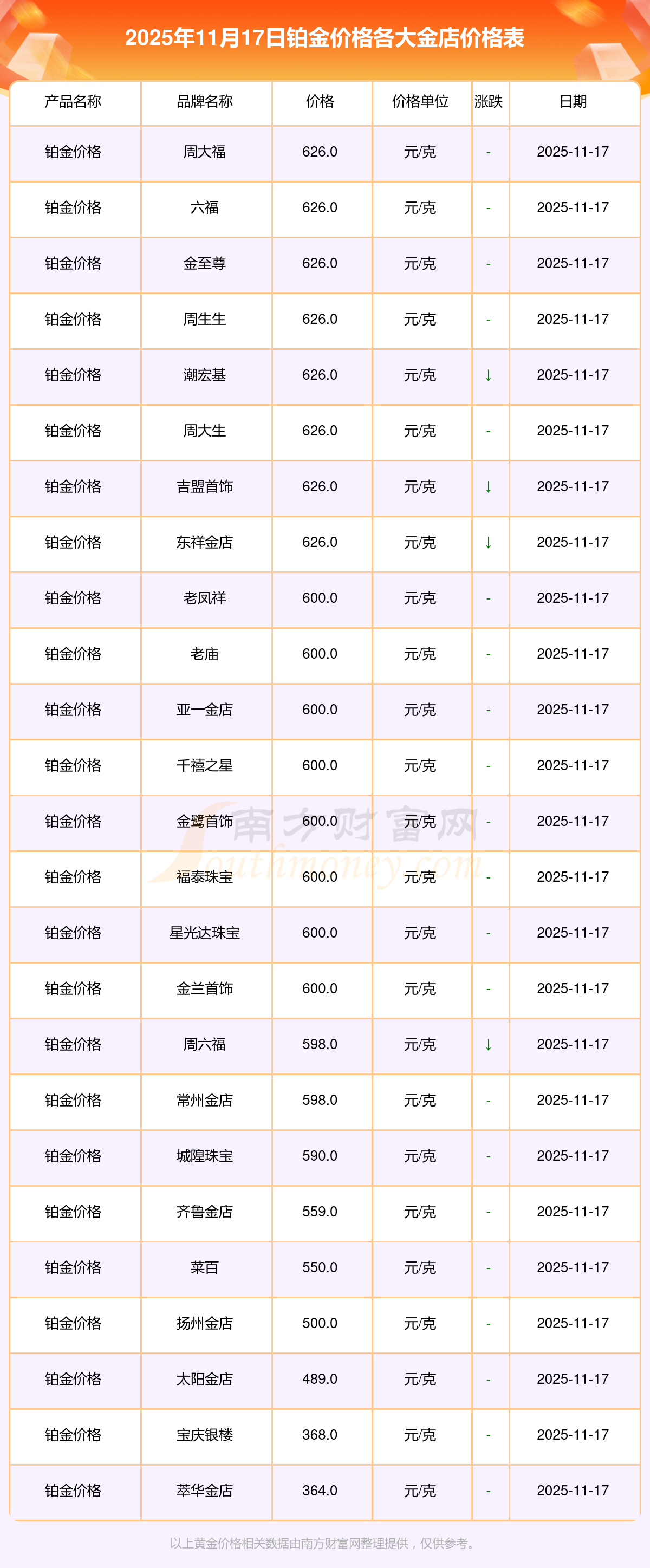 今天是2025年11月17日,谢瑞麟、谢瑞麟、谢瑞麟、谢瑞麟、金银街、金银街、金银街、金银街、金银街、金银街、多边金都珠宝等各大金店品牌铂金价格最新价格如下:谢瑞麟1305.0元/克、谢瑞麟46270.0、谢瑞麟13490.0、谢瑞麟41990.0、金银街1280.0元/克、金银街1295.0元/克、金银街1285.0元/克、金银街11.5元/克、金银街921.0元/克、金银街10.7元/克、多边金都珠宝1256.0元/克。