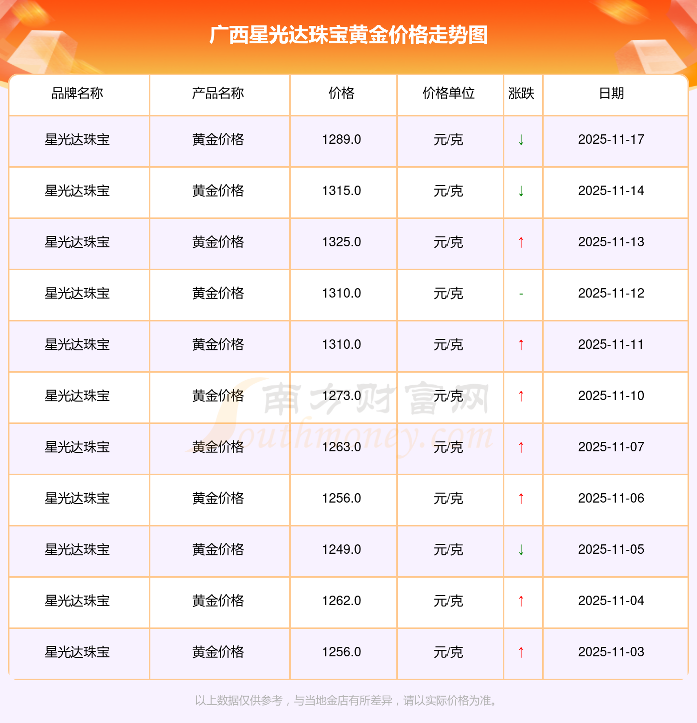 今日广西星光达珠宝黄金价格公布想咨询下,今日黄金每克要多少钱2025年11月17日广西星光达珠宝黄金价格为1289.0元/克。